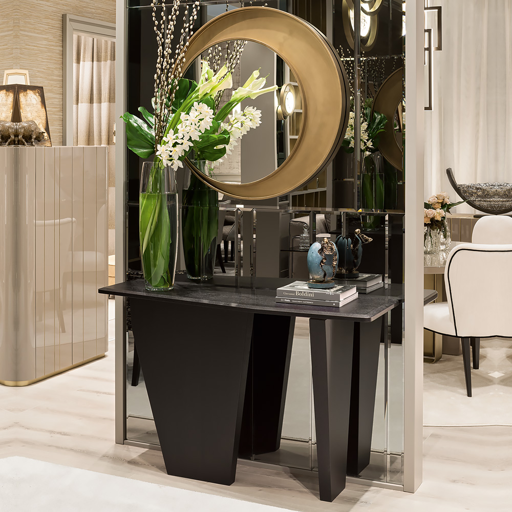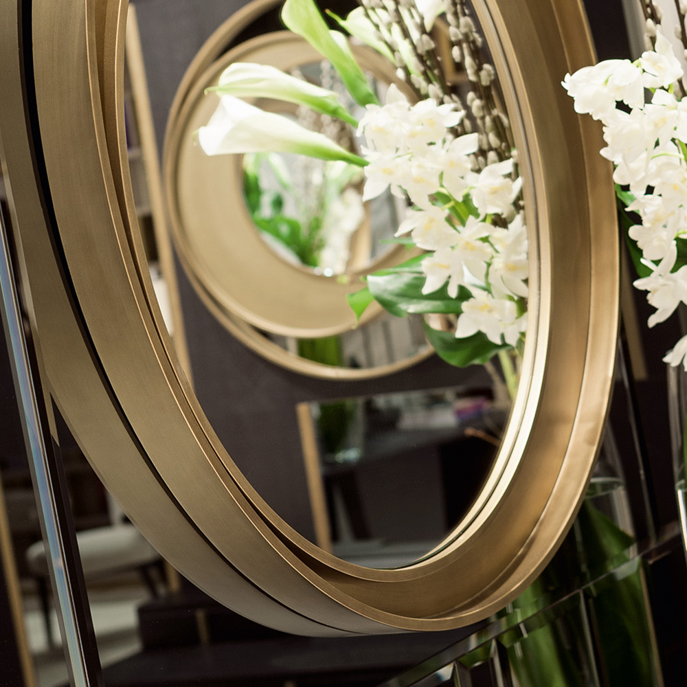 Superbly executed by master Italian craftsmen this fabulous mirror is outstanding in its use of luxury materials and attention to detail. The finest refined metal structure in a fabulous bronze finish. Available in 2 sizes as standard, diameter 90 cm x depth 5 cm – Weight 25 kg, and diameter 120 cm x depth 5 cm – Weight 34 kg. Also available in a triple circular design, and in various other finishes and sizes by request. Prices will vary.