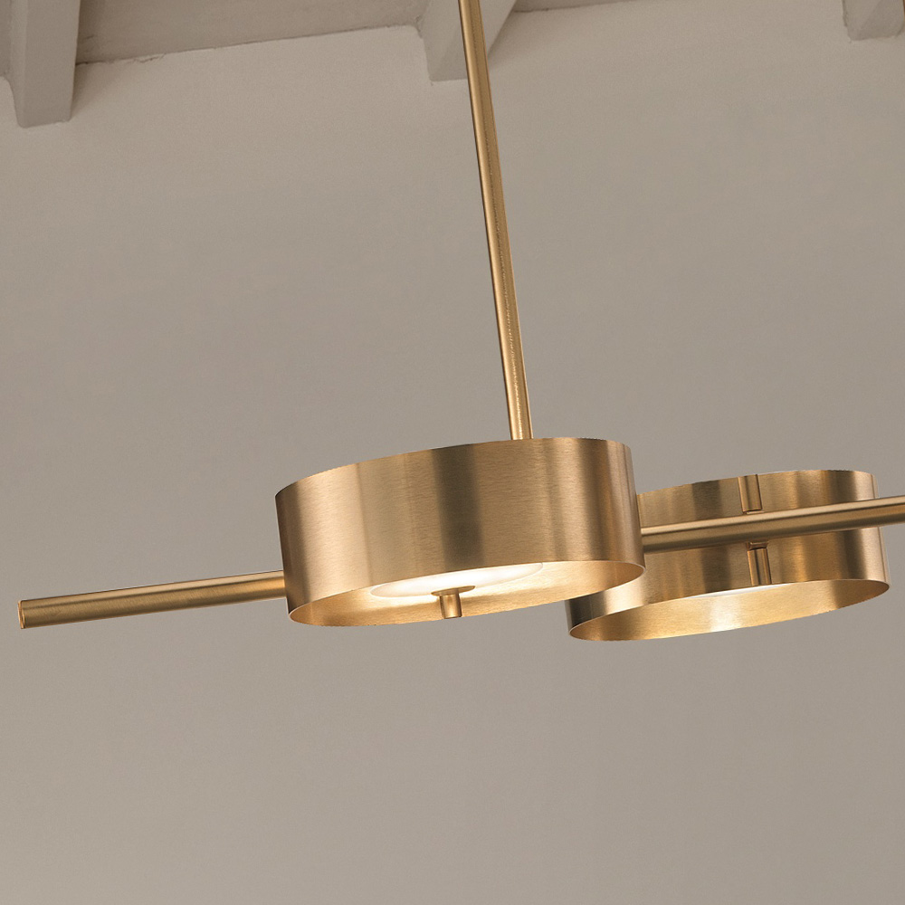 A row of three round brushed gold-plated shades feature in this stunning modern chandelier, each complete with a decorated glass diffuser. Perfectly suited to place in a dining room or luxury kitchen diner. Suspended by two gold metal rods which are offered in alternative heights for complete versatility. Altogether providing a truly stunning focus. Height options are as follows: A – 38 cm / B – 58 cm / C – 78 cm. Width 134 cm x depth 64 cm.