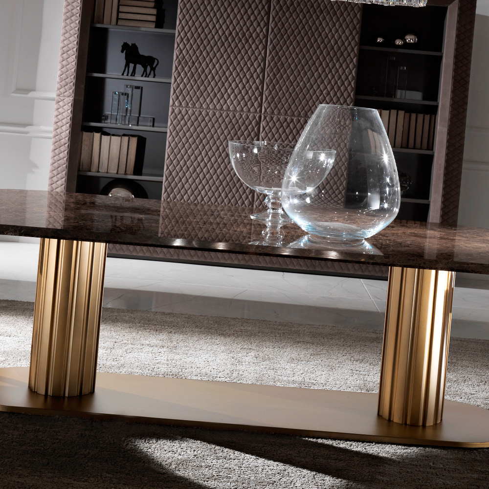 The Contemporary Italian Large Oval Marble Dining Table and Chairs Set is striking. Manufactured to the highest quality by the finest Italian furniture makers indeed. Not only offering new dimensions in the home, but also in business interiors. The stunning oval 30 mm dark Emperador marble table top works perfectly in complete contrast with the statement base. Two polished stainless steel ridged pillars in a striking antique satin bronze finish act as supporting legs standing on a matching oval plinth. The excellent physical properties of this design gives this table a unique presence.