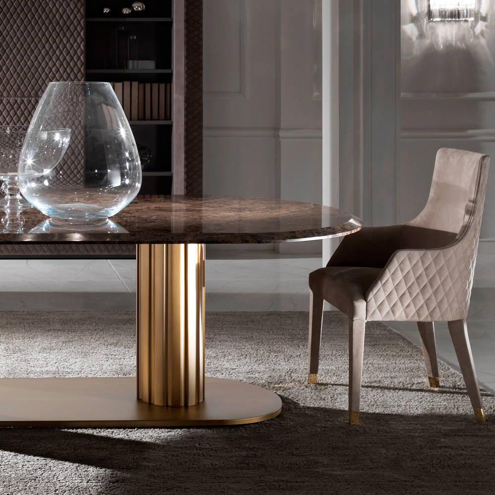 Comfortably seating eight people and designed for modern living. Use as a seductive dining table in a contemporary dining room or as an impressive statement in a modern high flying board room. Height 77 cm x width 280 cm x depth 120 cm. Paired in perfection together with the quilted leather dining chairs, fully padded and upholstered in warm beige nubuck providing supreme comfort. Statement upholstered legs completed with the most refined polished 24 carat gold glides. The quilted curving back panel detailing adds sumptuous detail, a touch of delicate charm. Height 95 cm x width 61 cm x depth 60 cm. Seat height 50 cm, arm height 64 cm.