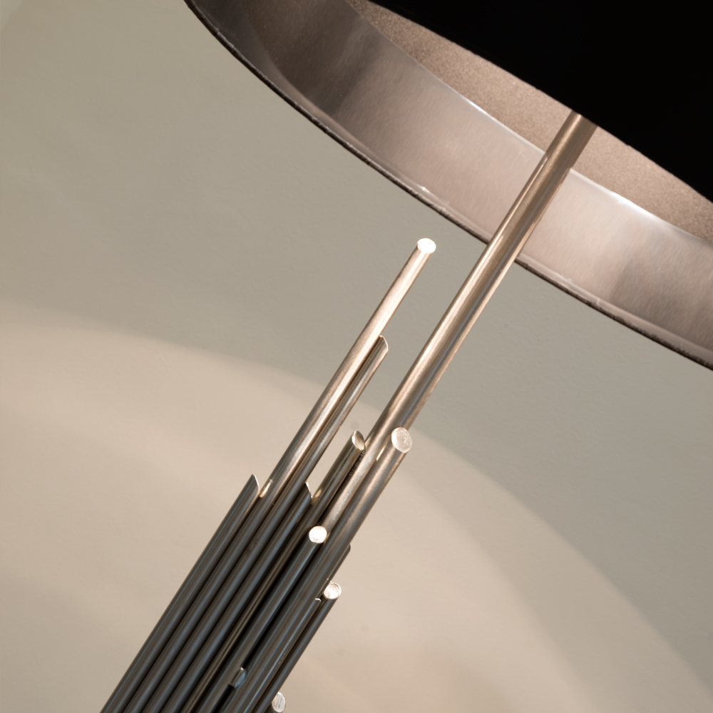 This fabulous design offers an elegant modern focus. The base features an angled column of slender wrought iron rods with a pewter finish. The black lampshade features a gold band running around the middle, which is only visible when switched on. Altogether providing a sophisticated focus with art deco overtones to your interior lighting decor.