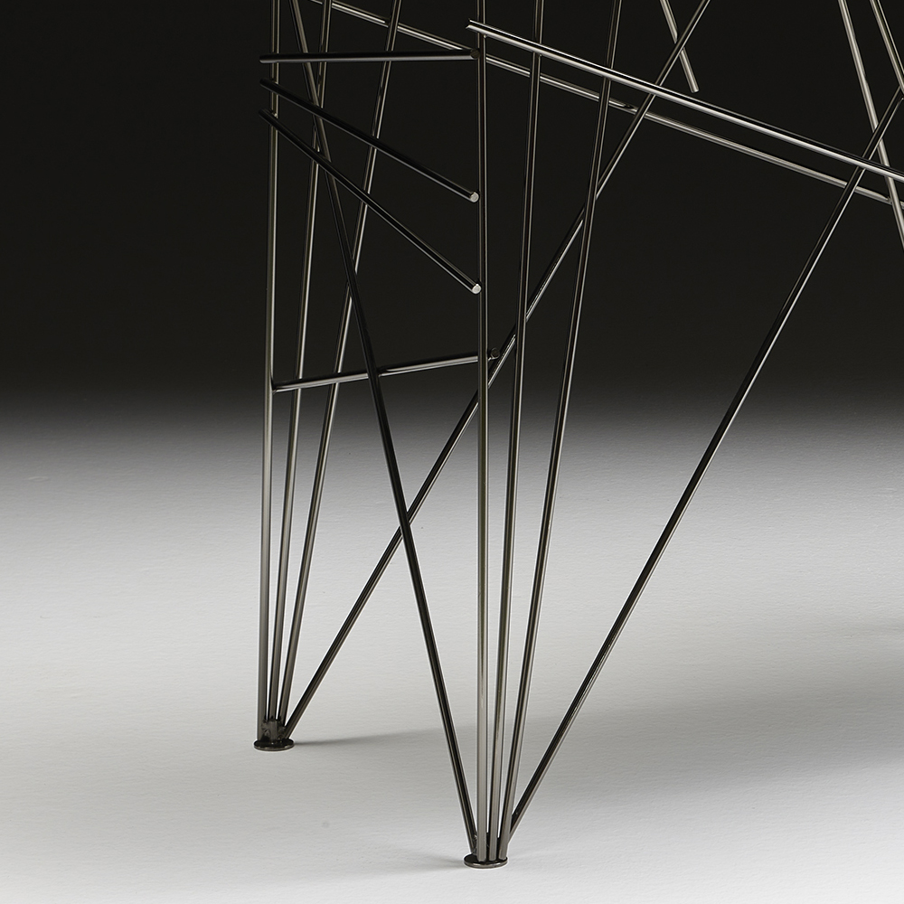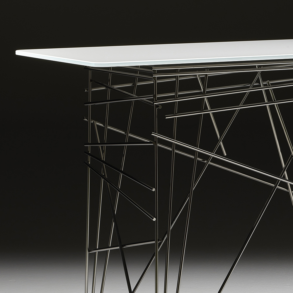 A true 1950’s design defining statement is expressed in the array of sculpted lines of the stainless steel base structure, in the finest Dark Chrome finish. Completed by a high gloss white lacquered glass top, creating a dramatic focus. Weight 50 kg. Alternative finishes and sizes are also available by request. Prices will vary.