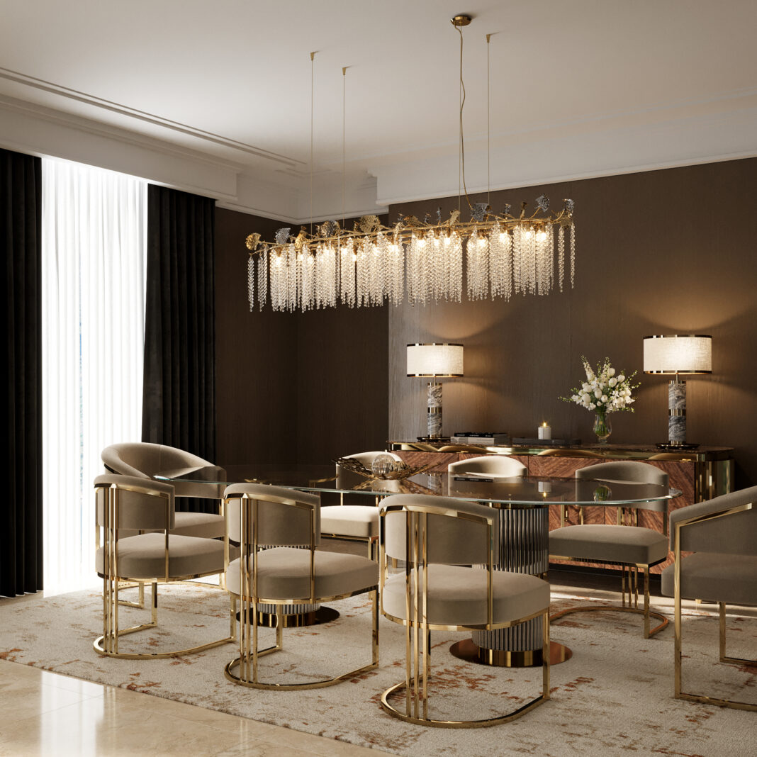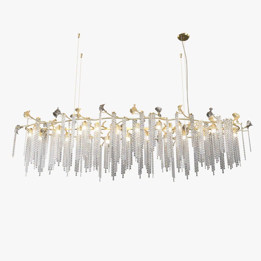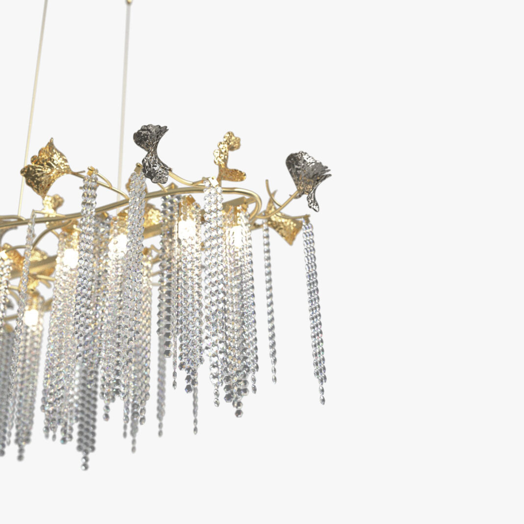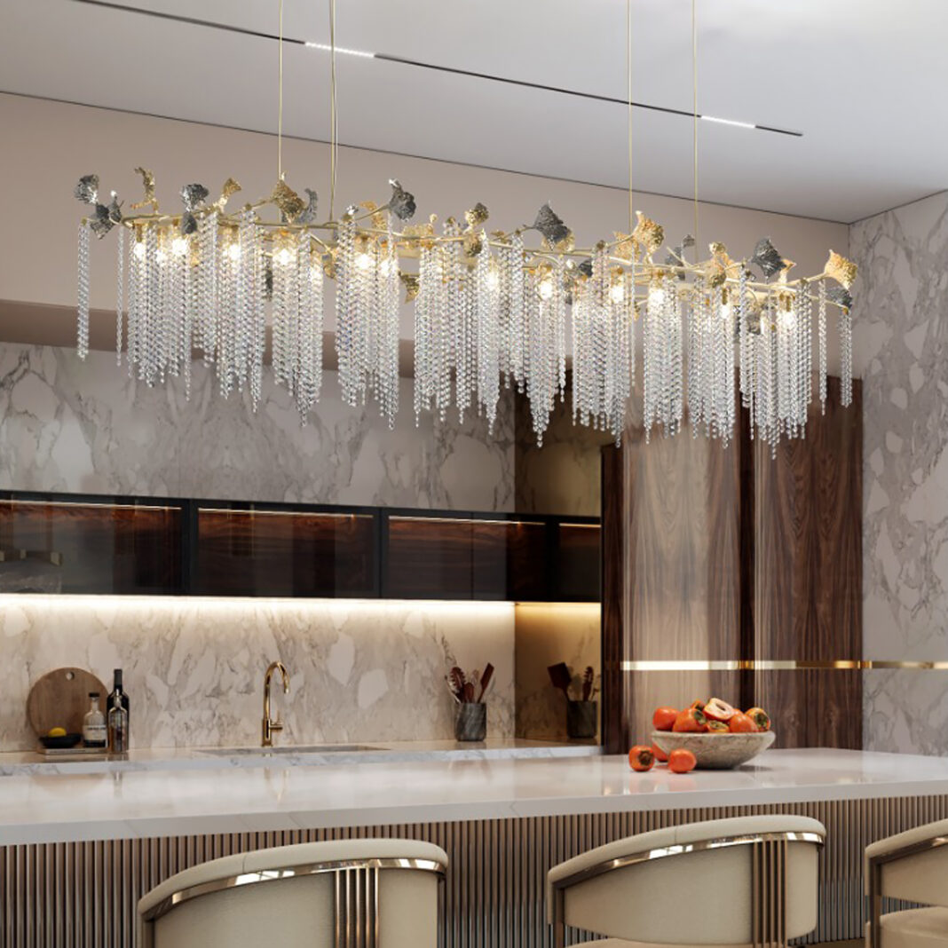 The Contemporary Leaf Chandelier with Crystal Drops blends refined elegance with a sleek, linear silhouette. Its graceful curves seem to float weightlessly, creating a striking and sophisticated focal point. More than a lighting fixture, this chandelier is a true statement piece – its unique form casting an enchanting dance of light and shadow. Ideal for illuminating dining tables or kitchen islands, it brings both drama and distinction to any space.