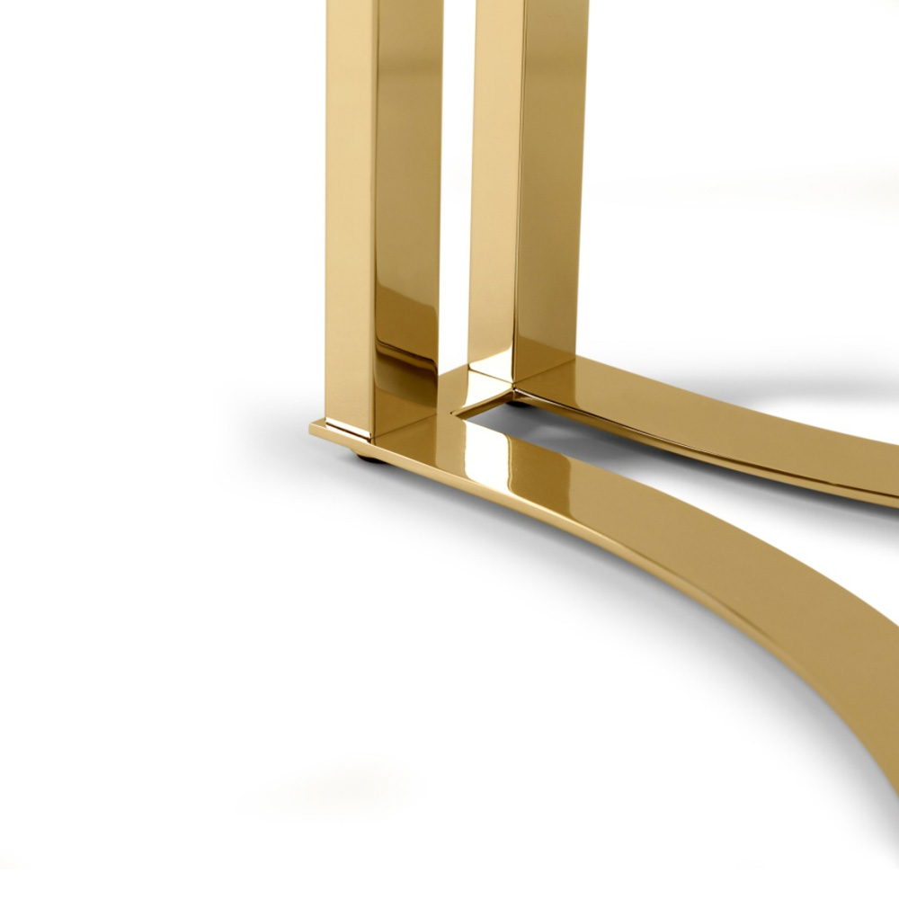 A modern statement wooden structure extending in to gently curved armrests, supported by statement modern legs providing a completely exclusive and deluxe look. Adding a unique touch. Formed in brass and shown here in a polished 24 carat gold finish. Padded in different densities for your comfort with warm leather upholstery. Available in various leathers and fabrics of varying combinations and other finishes, such as a matt, polished and brushed gold, brass, nickel, black nickel and copper and any matt or high gloss RAL lacquer. Offering the ultimate in versatility. Prices may vary.