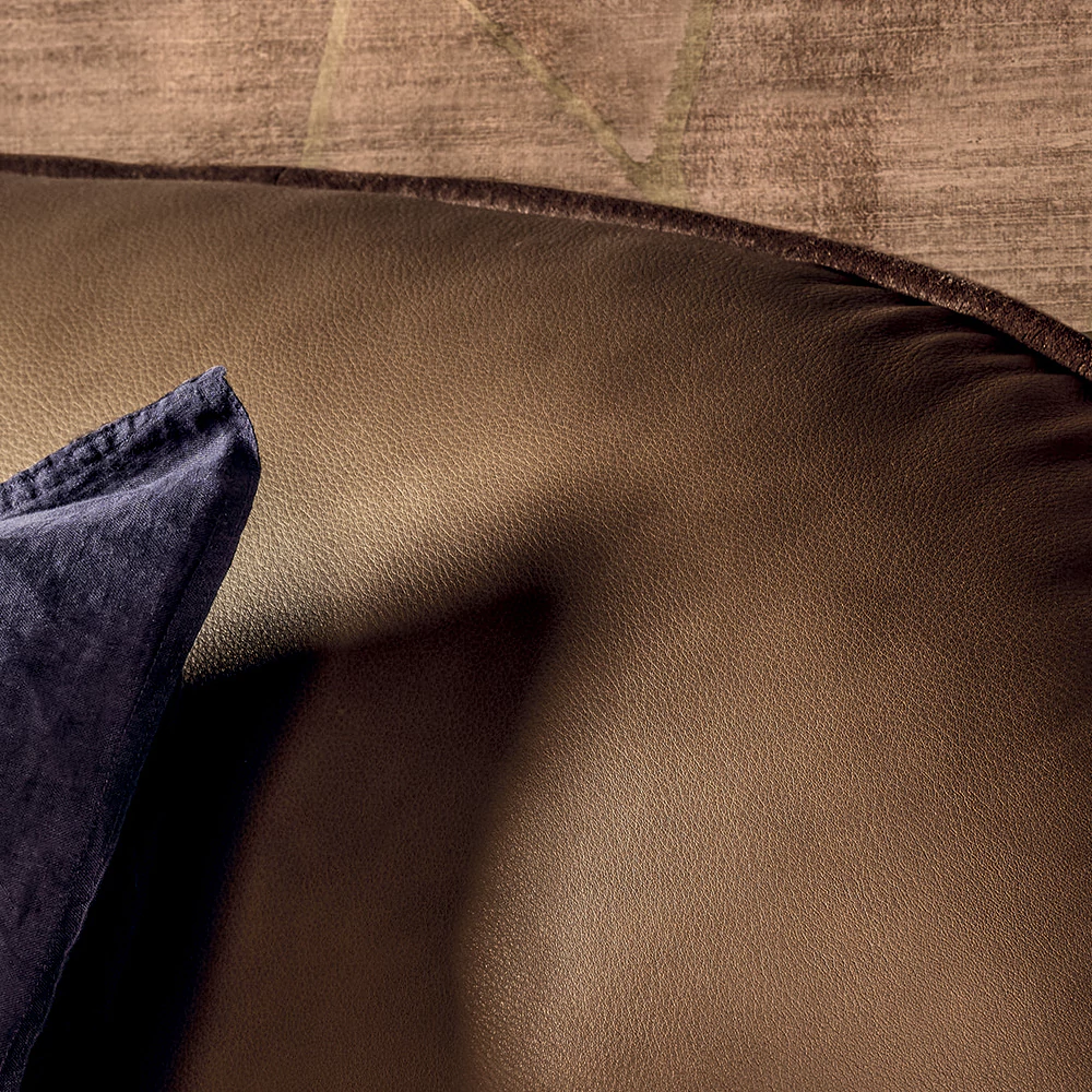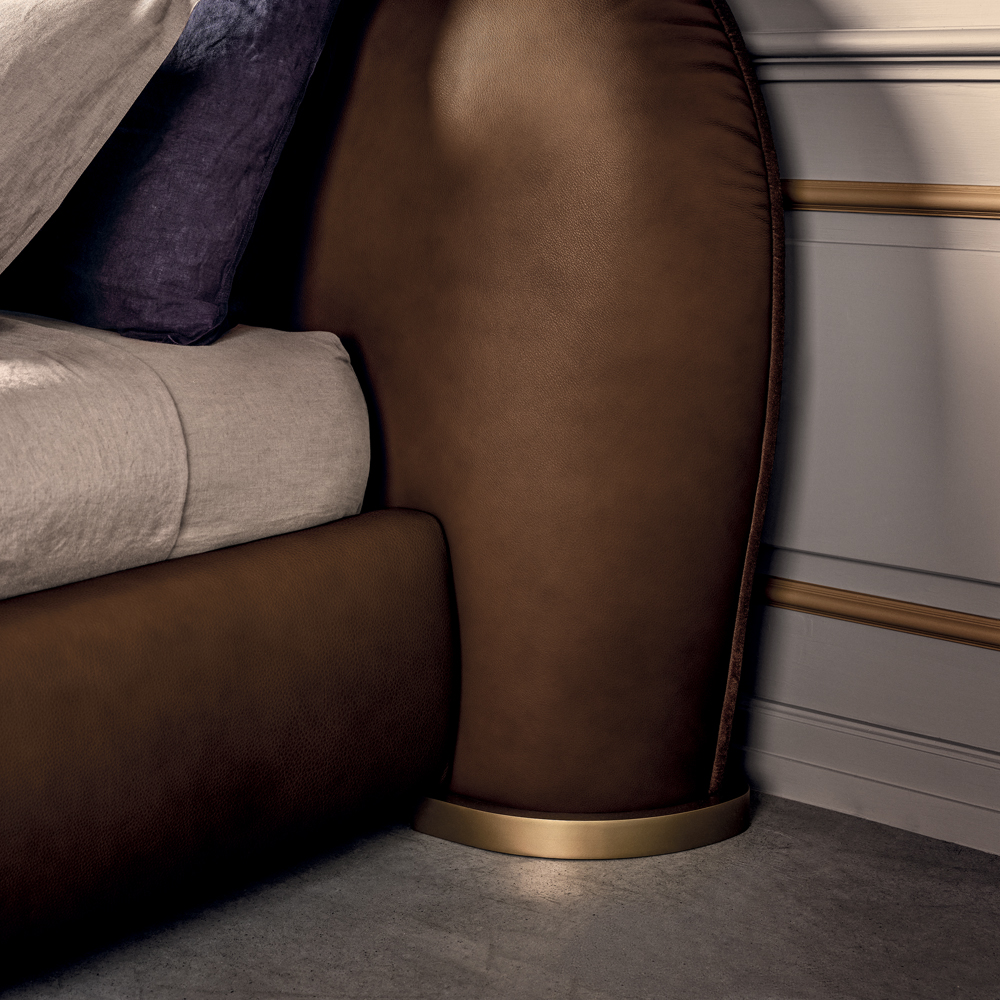 The headboard and base are a solid poplar wooden structure. Padded in foam and memory foam in various different densities for the ultimate in luxurious comfort with a wooden slatted base. Shown here upholstered to the highest standard in the finest Italian leather, with rich tonal velvet piping detail. Completed by unique metal profile detailing in a matt gold finish. Available in 2 sizes as standard. Height 105 cm x width 237 cm x length 235 cm, base height 30 cm x width 192 cm and height 105 cm x width 257 cm x length 235 cm, base height 30 cm x width 212 cm. Covers not removable. Alternative metal finishes, upholstery in various leathers and other fabrics including customers own and customised sizes such as King and Queen upon request. Prices will vary. Please note that the mattress is not included.