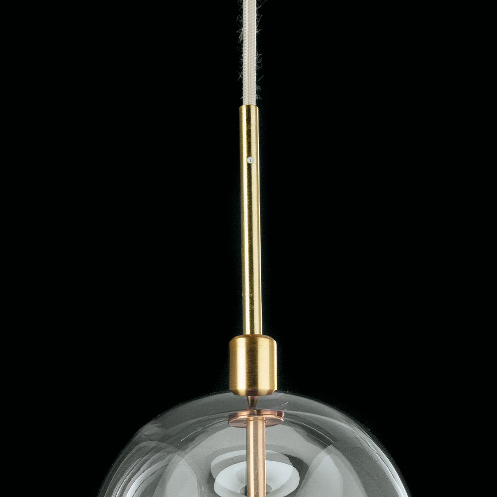 This pendant light features a brushed brass frame with a long, narrow glass dome shade. Dimmable 3000K CRI90 LED bulb included. Weight 4.4 kg. Available in two sizes as standard – long version height 33 cm x diameter 19 cm, short version height 25 cm x diameter 23 cm. Hanging cable included – max height 180 cm. Also available in three finishes: clear, blue, or purple glass.