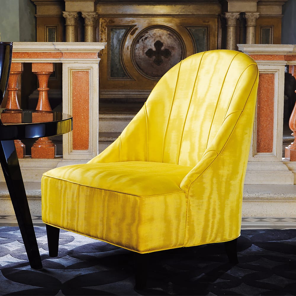 This sleek modern armchair is beautifully upholstered to the highest stands in a smart yellow cotton and synthetic mixed fabric. Elegant legs in a high gloss black lacquer finish complete this sophisticated design. Measuring height 91 cm x width 70 cm x depth 80 cm, seat height 38 cm. This stunning design is also available in alternative fabrics and leather, with a choice of matt lacquered legs and piping in contrasting shades. Prices will vary.