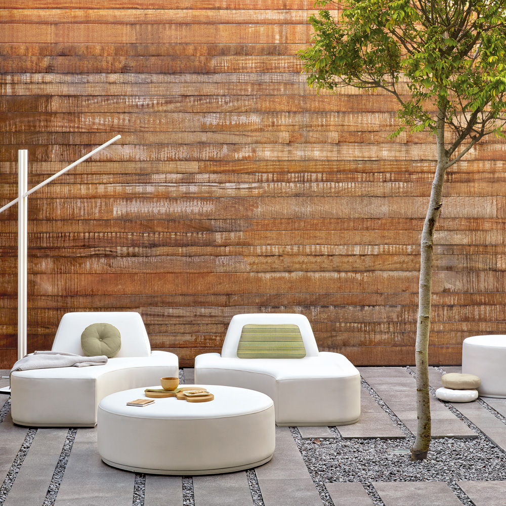 Versatile, from an intimate lounge sofa to a large lounge island. Express yourself, and let your imagination run wild using an extensive range of fabrics. Smooth curved lines, offering the ultimate in comfort and style. Technical complexity, each piece created by hand. Height 63 cm x width 265 cm x depth 186 cm, seat height 34 cm. Weight 56.5 kg. Shown here in a contemporary white leather, a sand tone fabric is also available as standard offering a dramatically different effect. Customised finishes are also available that come in Cat A and Cat B, giving you the option of mixing many shades, textures and tones – as shown. Swimming pool and sea water resistant and repellent. Easy to clean and maintain. Recyclable, GreenGuard certified, REACH certified. The finest of All Weather Fabrics, that have been specifically developed for outdoor use. The fabric is mass-coloured, UV-resistant and does not fade under the influence of light or sunshine. Padded using Quick Dry Foam, a foam with a special structure that ensures that the water runs through three times faster enabling it to ultimately dry three times faster than high resilience foam.