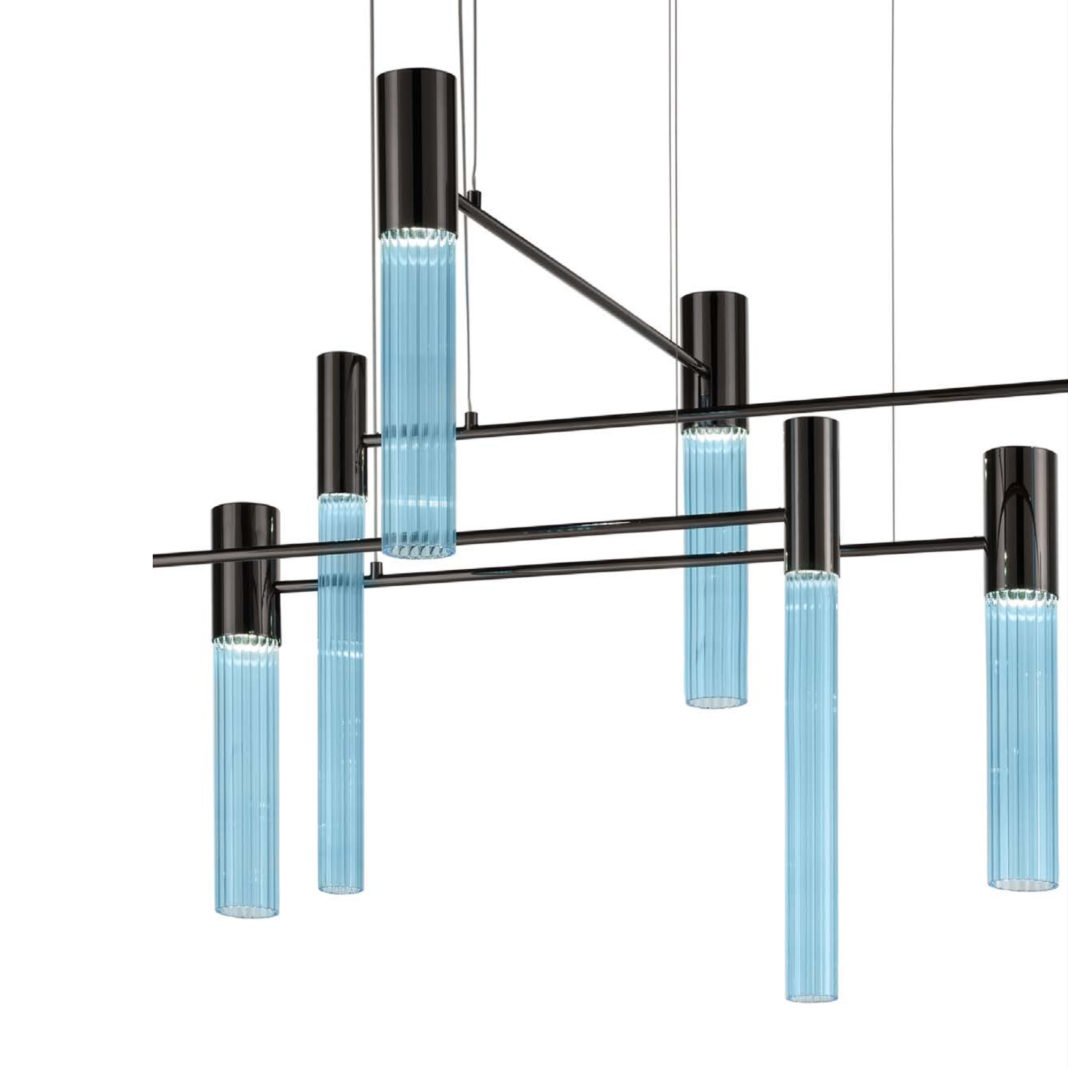 Modules that can be configured in various ways and in different shapes. Horizontal in style and creating a beautiful outline, handmade iron structures in a polished black finish support aquamarine borosilicate glass tubes. A combination of three modules, height 40.5 cm x width 82 cm x depth 6.5 cm – with tube diameters of 6 cm, height 50.5 cm x width 138 cm x depth 4.5 cm – with tube diameters of 4 cm, and again at height 40.5 cm x width 82 cm x depth 6.5 cm – with tube diameters of 6 cm. Each module requires 2 (6 in total) x LED star – 9W – 4000°K – 12 Vdc – SMD z5m5 880 lm – lifetime 30.000 h. This style is compatible with a Dali dimmable system. Dimensions are plus hanging cables and grippers, the ceiling cup and chain has the minimum height of 24 cm and maximum height of 150 cm. Wall light also available, and also in a polished gold finish with Transparent, Smoked Grey or Taupe glass tubes by request. Prices will vary.