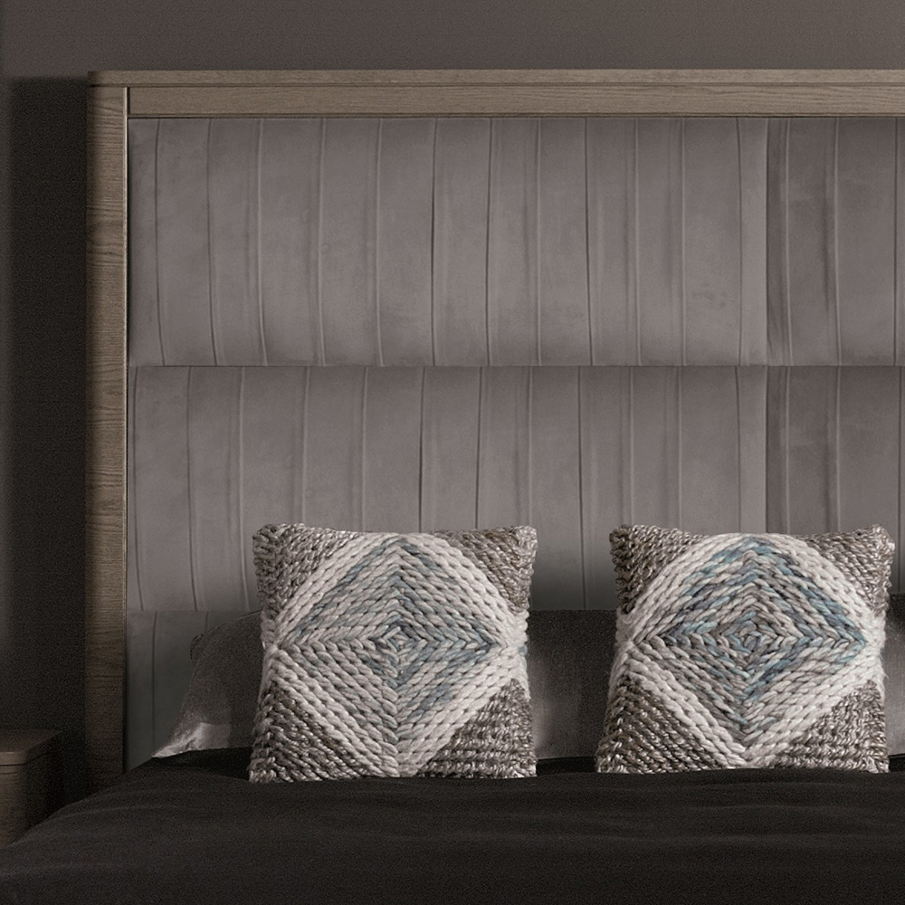 This chic king size bed, to fit a 180 cm x 200 cm mattress – boasts a matte tobacco oak finish, sublimely complemented by a sleek black nickel trim. Complete with pleated upholstery details. Optional storage lift base available by request. Available in a variety of finishes. Prices will vary.