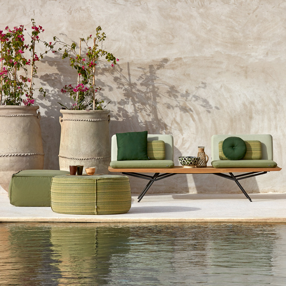 Beautifully minimal by design, and shown here with a lava powder coated finish frame structure. Sculpted from the finest Iroko Wood known for its durability, refined to expose every detail. Supported by discreet adjustable feet. Back rest panel and cushions, including the seat cushions, matching back cushions, matching back rests and three deco cushions: two 52 x 24 cm, and one 30 cm diameter.