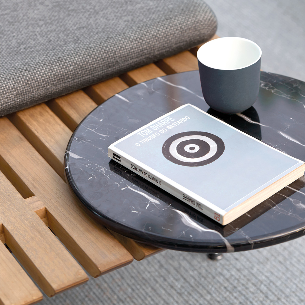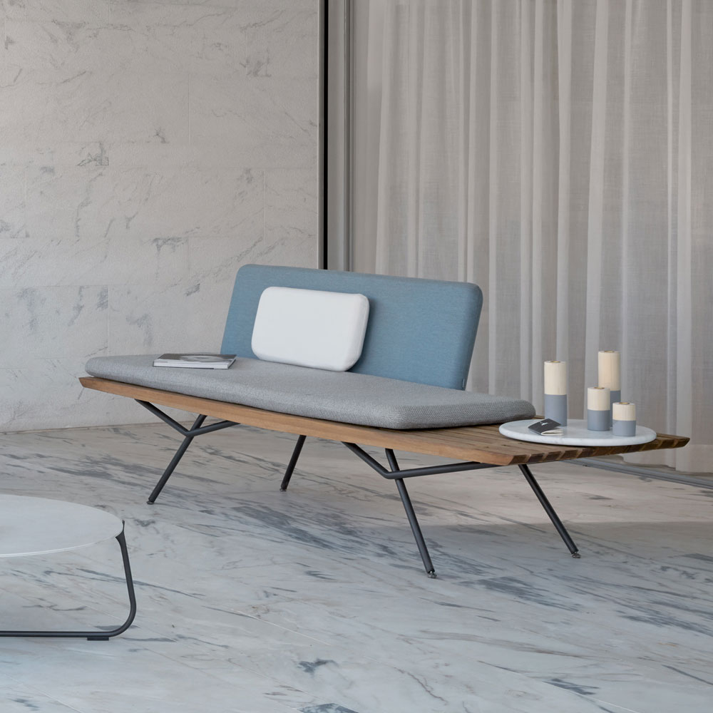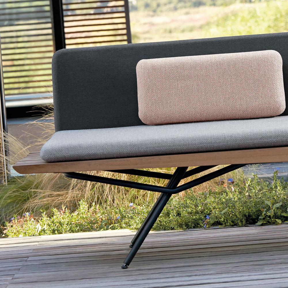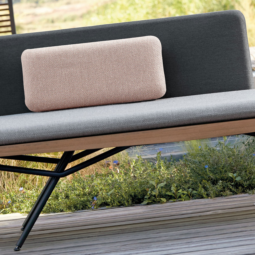 Sculpted from the finest Iroko Wood known for its durability, refined to expose every detail. Beautifully minimal by design, and shown here with a lava powder coated finish frame structure. Supported by discreet adjustable feet. Back rest panel and cushions, including the seat cushion, matching back cushion, back rest and two deco cushions: one 52 x 24 cm, and one 30 cm diameter.