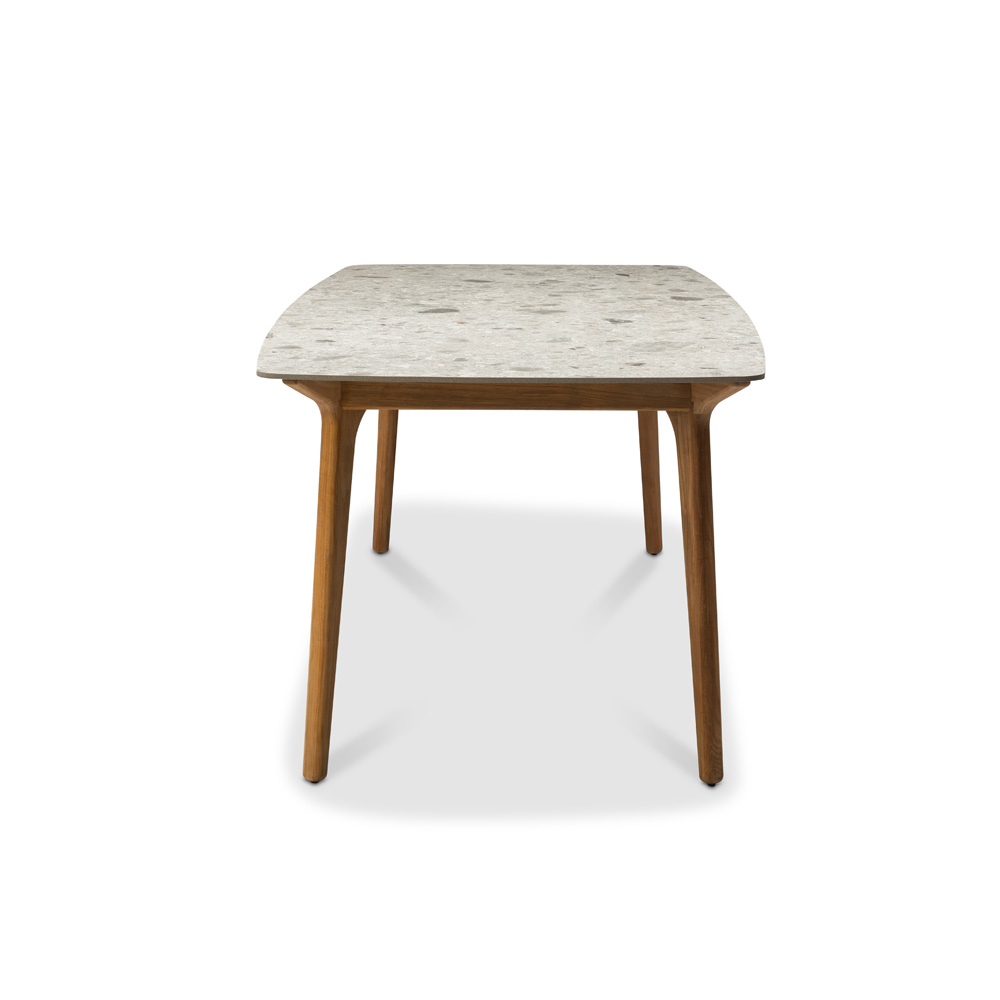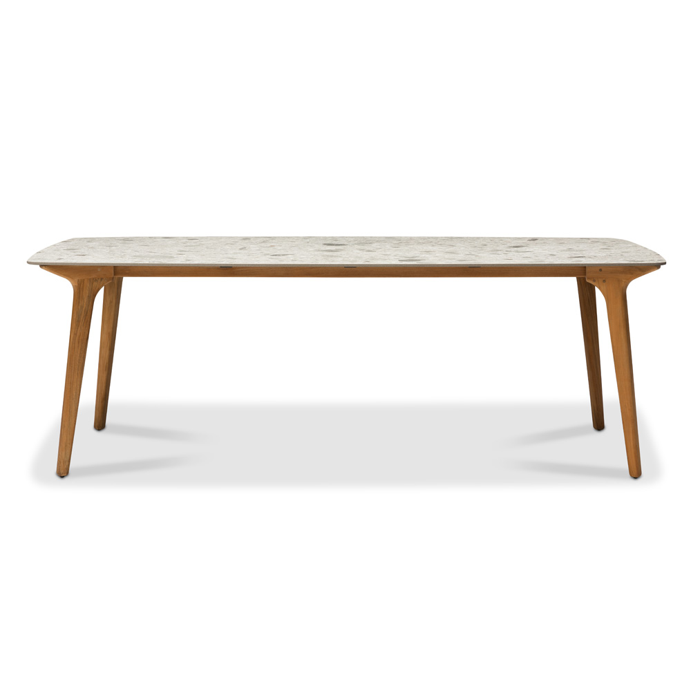 The table is created by hand. Slender and lightweight with its sculpted, solid wooden base in brushed natural teak finish revealing the detail of the grain. Shown here with a ceramic faux fossil stone top. Various finish combinations are available, as shown. Prices may vary. Various table sizes available, shown here at height 73 cm x width 264 cm x depth 118 cm.