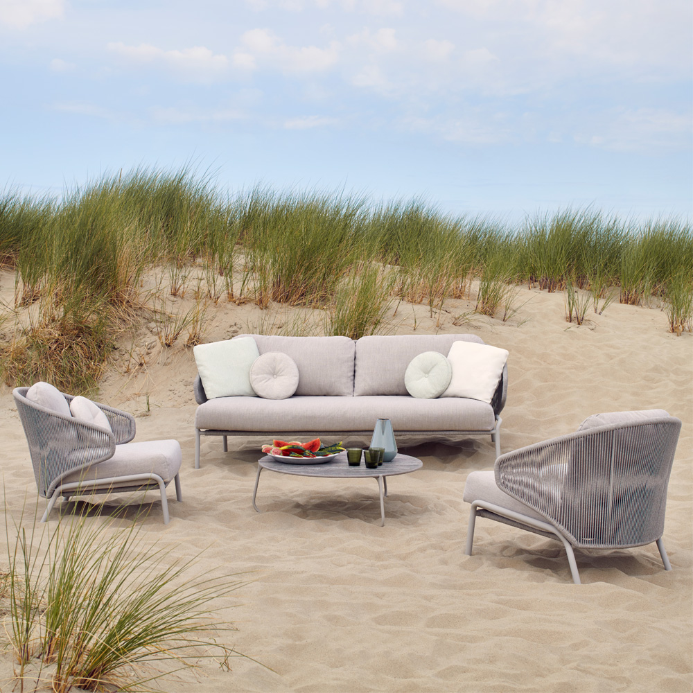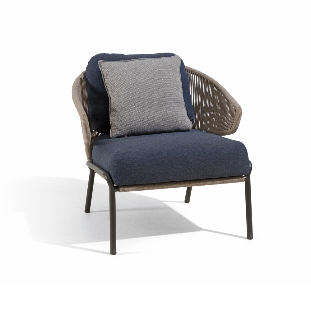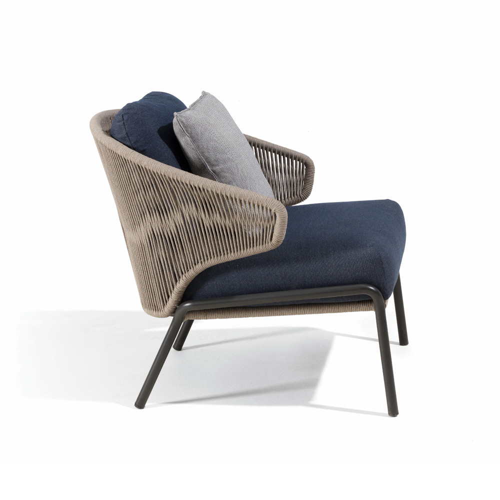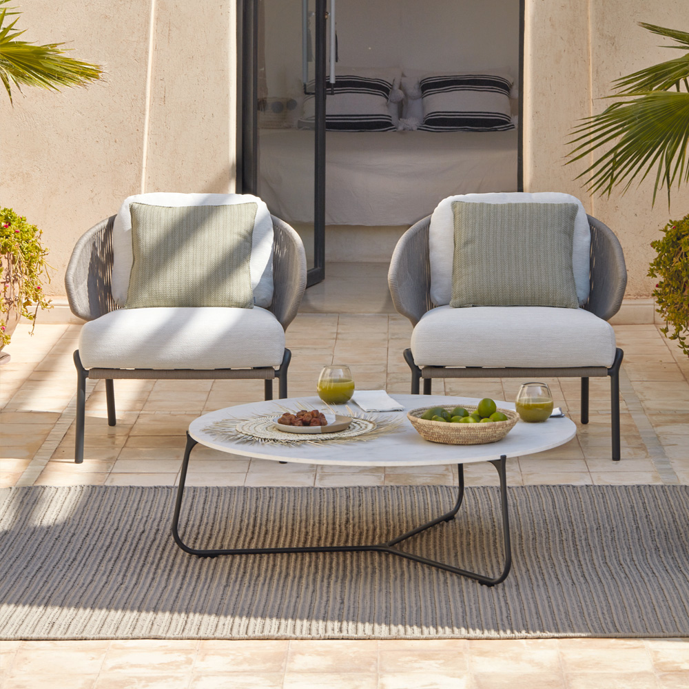 Superbly executed by master craftsmen this design is outstanding in its use of luxury materials and attention to detail. The wrap-around back and armrests made entirely out of rope, blend seamlessly and give each piece a neo modern yet timeless look offer the ultimate in comfort and style. Technical complexity, each piece created by hand. Shown here with an intriguing mix of a powder coated aluminium frame and contemporary 4.5 mm woven rope. Various finish combinations are available, as shown. Swimming pool and sea water resistant and repellent. Easy to clean and maintain. Recyclable, GreenGuard certified, REACH certified. The finest of All Weather Fabrics, that have been specifically developed for outdoor use. The fabric is mass-coloured, UV-resistant and does not fade under the influence of light or sunshine. This design is also available in a matching Sun Lounger, Sofa, Dining Chair and Barstool. Creating a fabulous set.