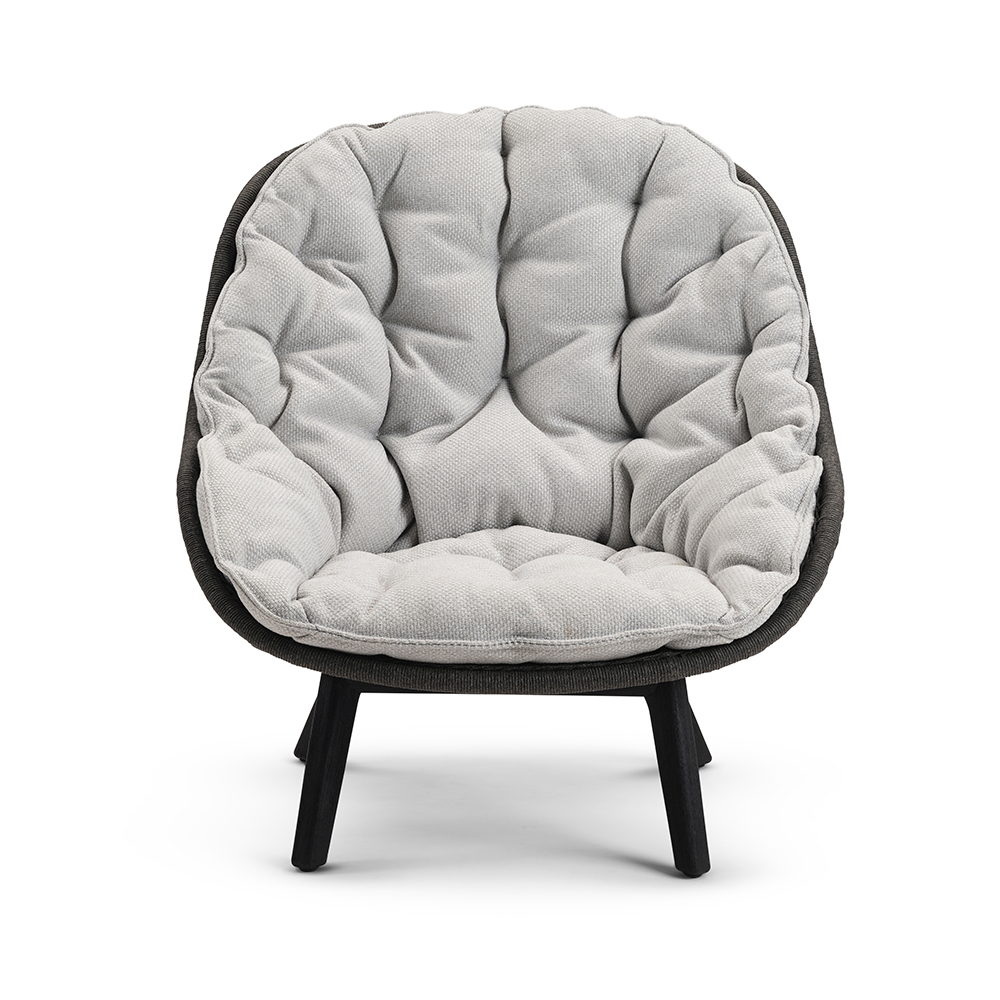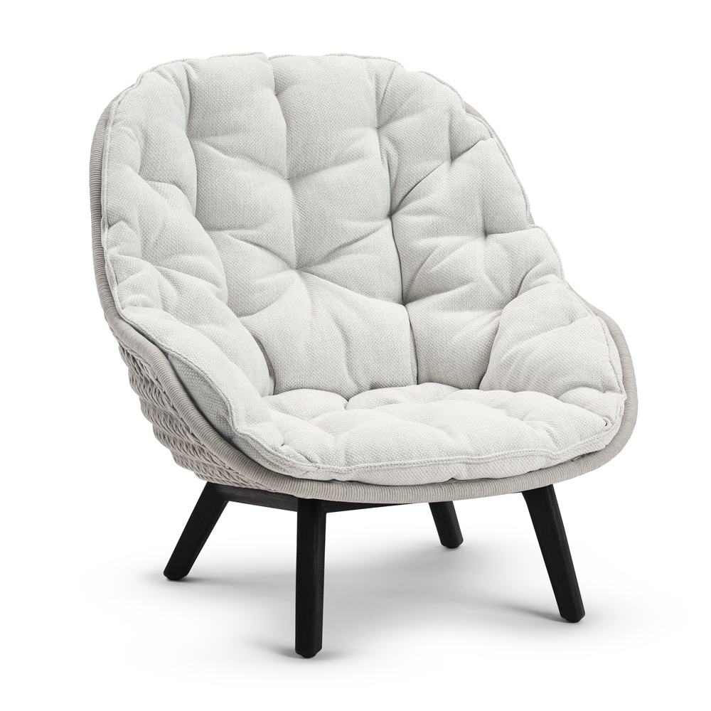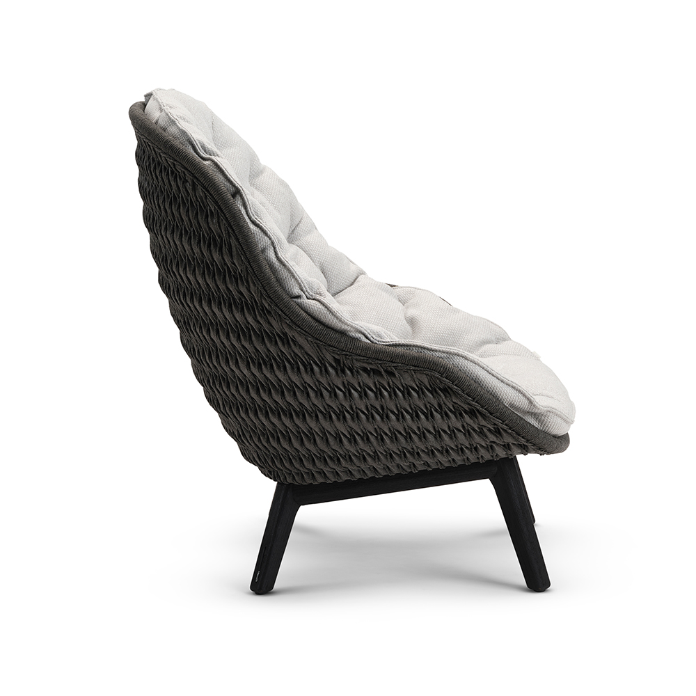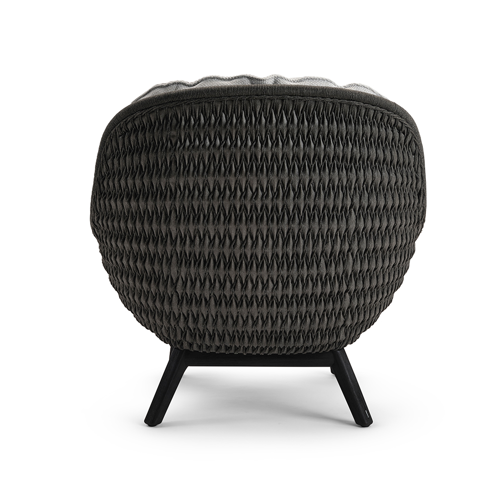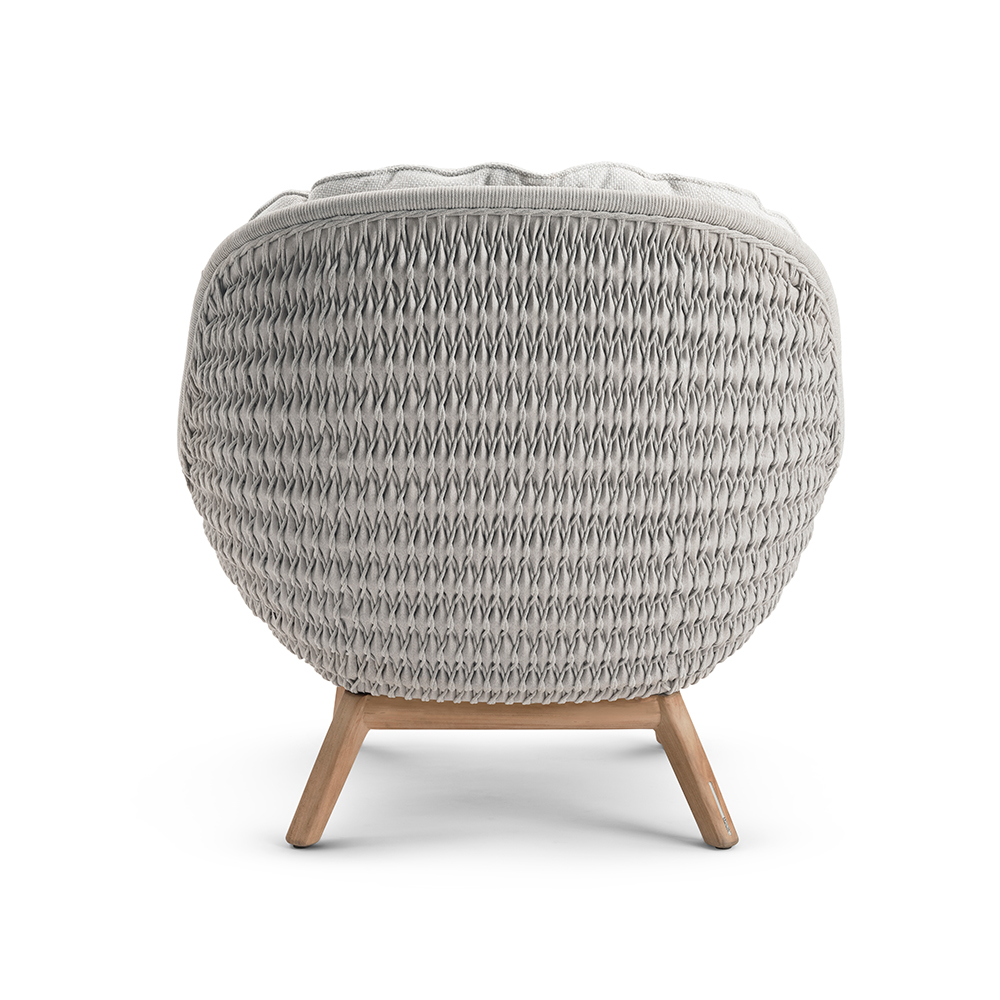 Superbly executed by master craftsmen this design is outstanding in its use of luxury materials and attention to detail. Technical complexity, each piece created by hand. Seat height 50 cm. Weight 13 kg. Shown in a natural teak, pepper cord and white fabric to the reversible cushion – suggested Combination A. Various combinations are available, as shown. Swimming pool and sea water resistant and repellent. Easy to clean and maintain. Recyclable, GreenGuard certified, REACH certified. The finest of All Weather Fabrics, that have been specifically developed for outdoor use. The fabric is mass-coloured, UV-resistant and does not fade under the influence of light or sunshine. Protective cover also available by request. Footstool also available, part of a fabulous collection.