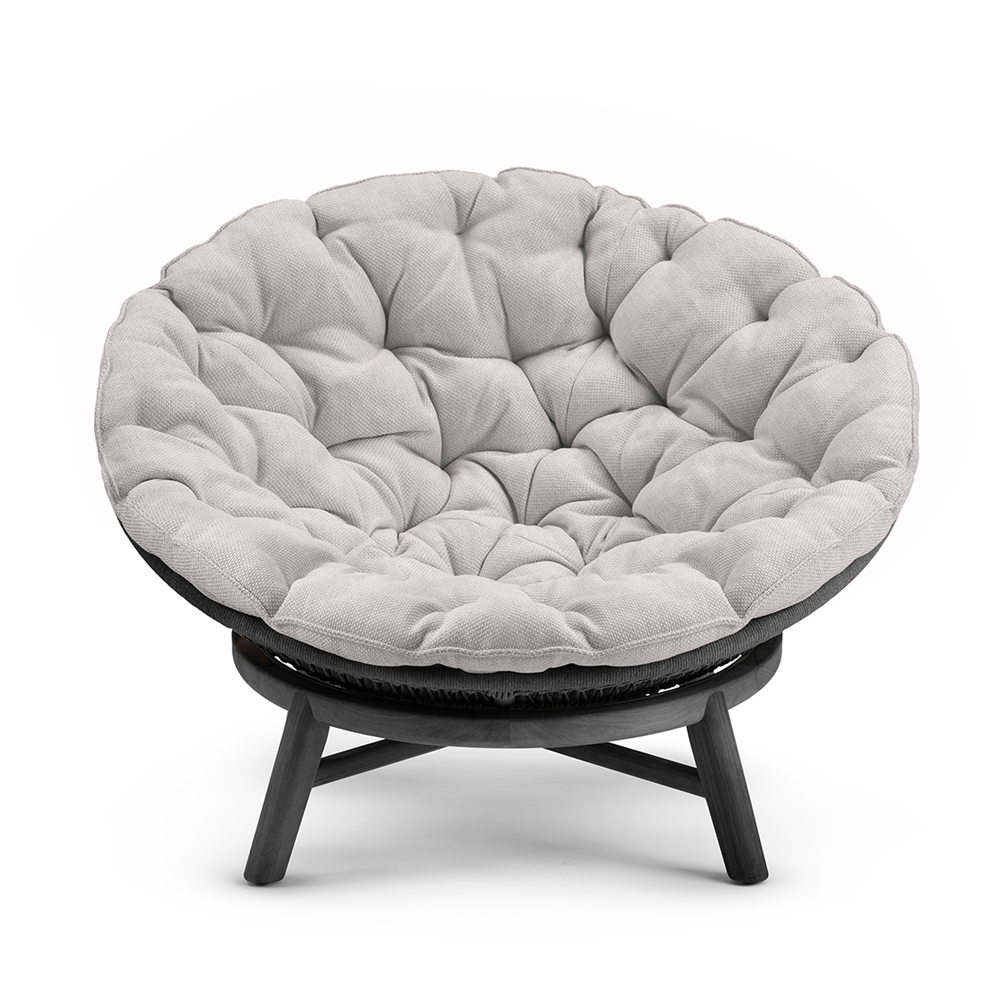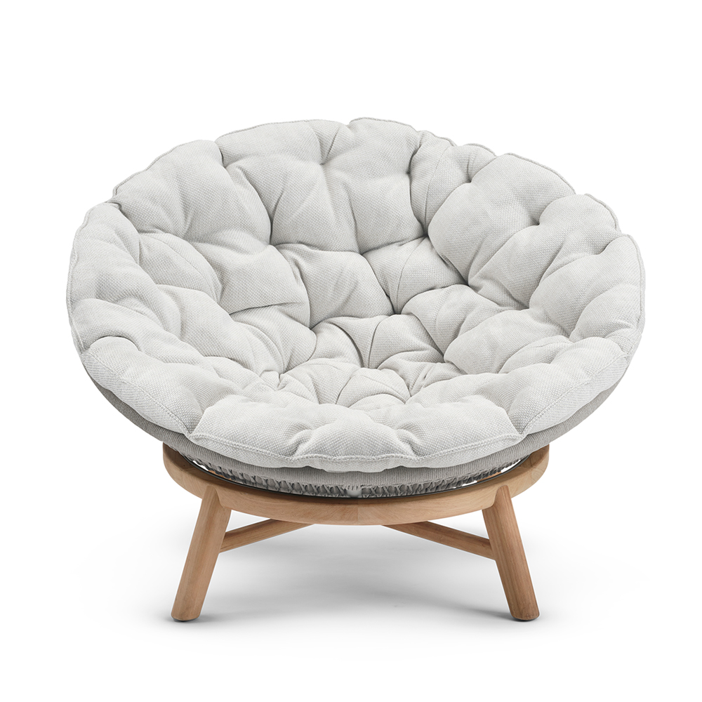 Superbly executed by master craftsmen this design is outstanding in its use of luxury materials and attention to detail. Technical complexity, each piece created by hand. Seat height 41 cm. Weight 19 kg. Shown in a natural teak, pepper cord and white fabric to the reversible cushion – suggested Combination A. Various combinations are available, as shown. Swimming pool and sea water resistant and repellent. Easy to clean and maintain. Recyclable, GreenGuard certified, REACH certified. The finest of All Weather Fabrics, that have been specifically developed for outdoor use. The fabric is mass-coloured, UV-resistant and does not fade under the influence of light or sunshine. Protective cover also available by request.