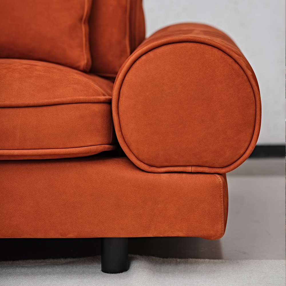 Low set bolster styles arm rests define this design. Upholstered to the highest standards in the finest Nubuck leather with piping detail. Nestled on statement legs in a matt black lacquered finish. A solid fir and poplar wooden structure, with an elastic belt spring system for added support. Seat and back cushions in 100% goose down feathers. Padded in foam and memory foam in various different densities for the ultimate in luxurious comfort. In 2 sizes as standard, height 87 cm x width 240 cm x depth 115 cm and height 87 cm x width 260 cm x depth 115 cm, seat heights 45 cm. Seat depth 60 cm. Removable cushion covers only in the leather finish, fully removable covers in a fabric finish. Customised sizes, and alternative leathers, fabrics and finishes including customers own are available by request. Prices will vary.