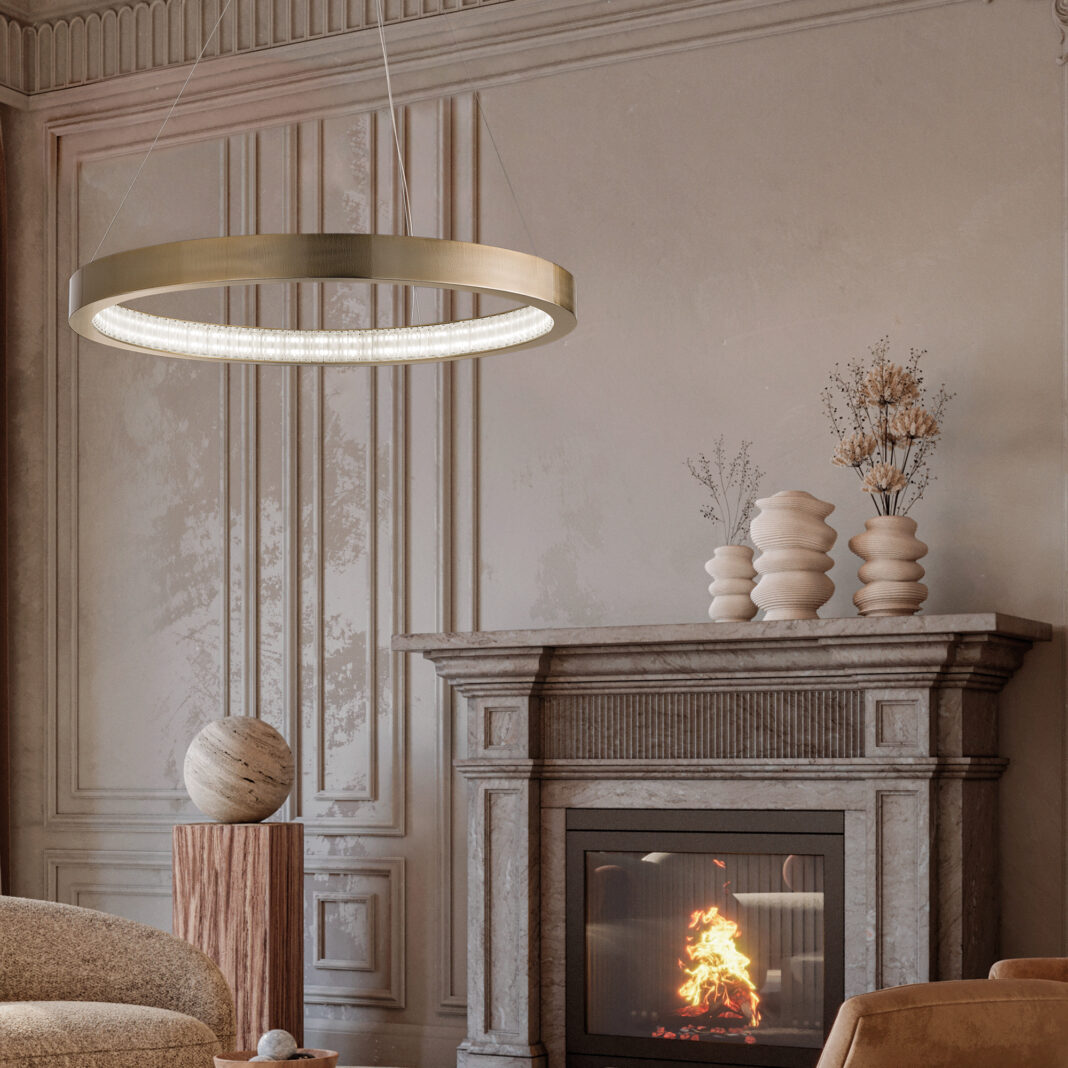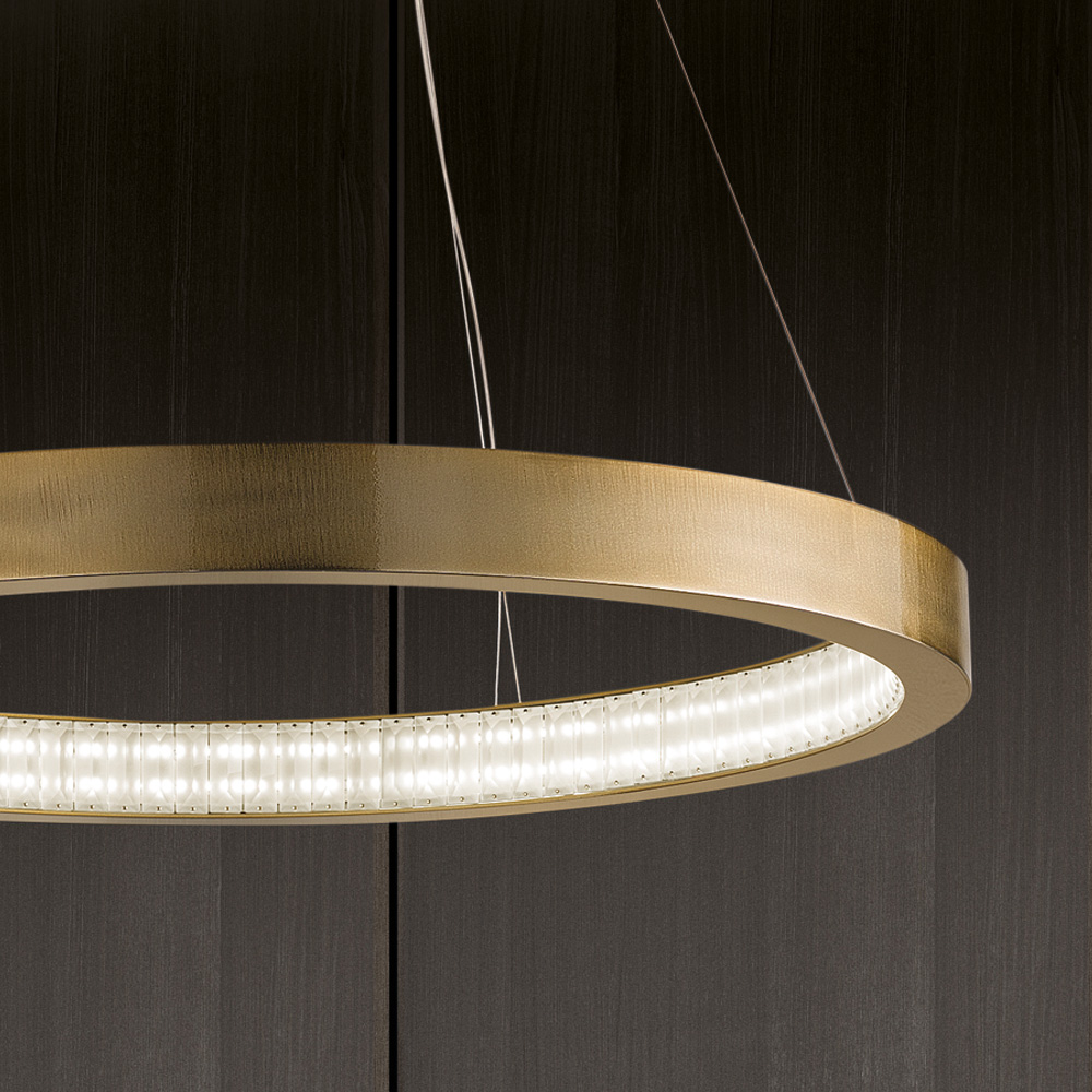 This chandelier features a stylish circular galvanised metal frame in a burnished brass finish with a matt crystal lozenge diffuser. With integrated LED lighting. Compatible with a dimmable 1-10V system. Available in four different sizes as standard, height 8.5 cm x diameter 140 cm, height 8.5 cm x diameter 115 cm, height 8.5 cm x diameter 90 cm and height 8.5 cm x diameter 60 cm. Comes with a 150 cm long transparent hanging cable as standard. Available in a variety of finishes by request, prices may vary.