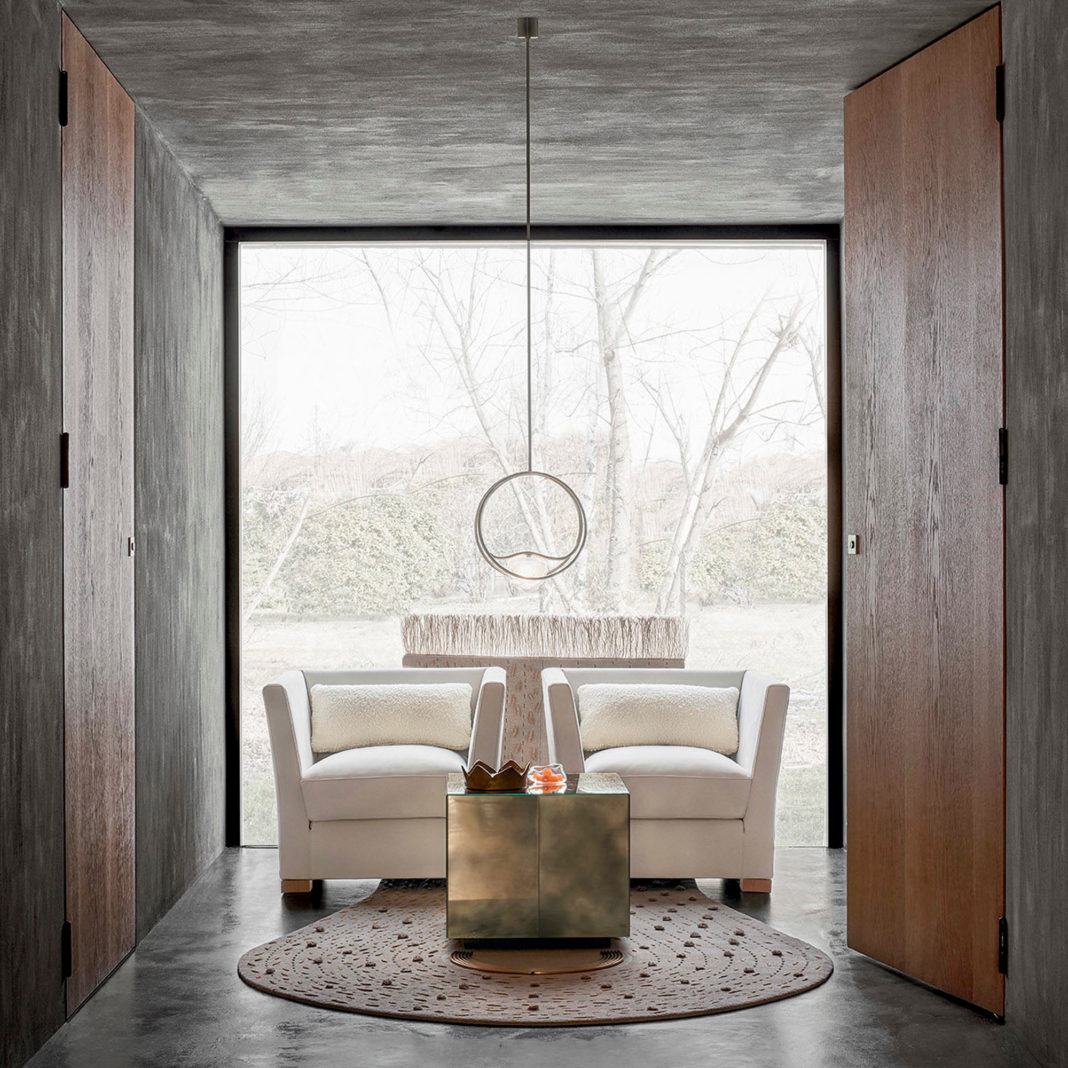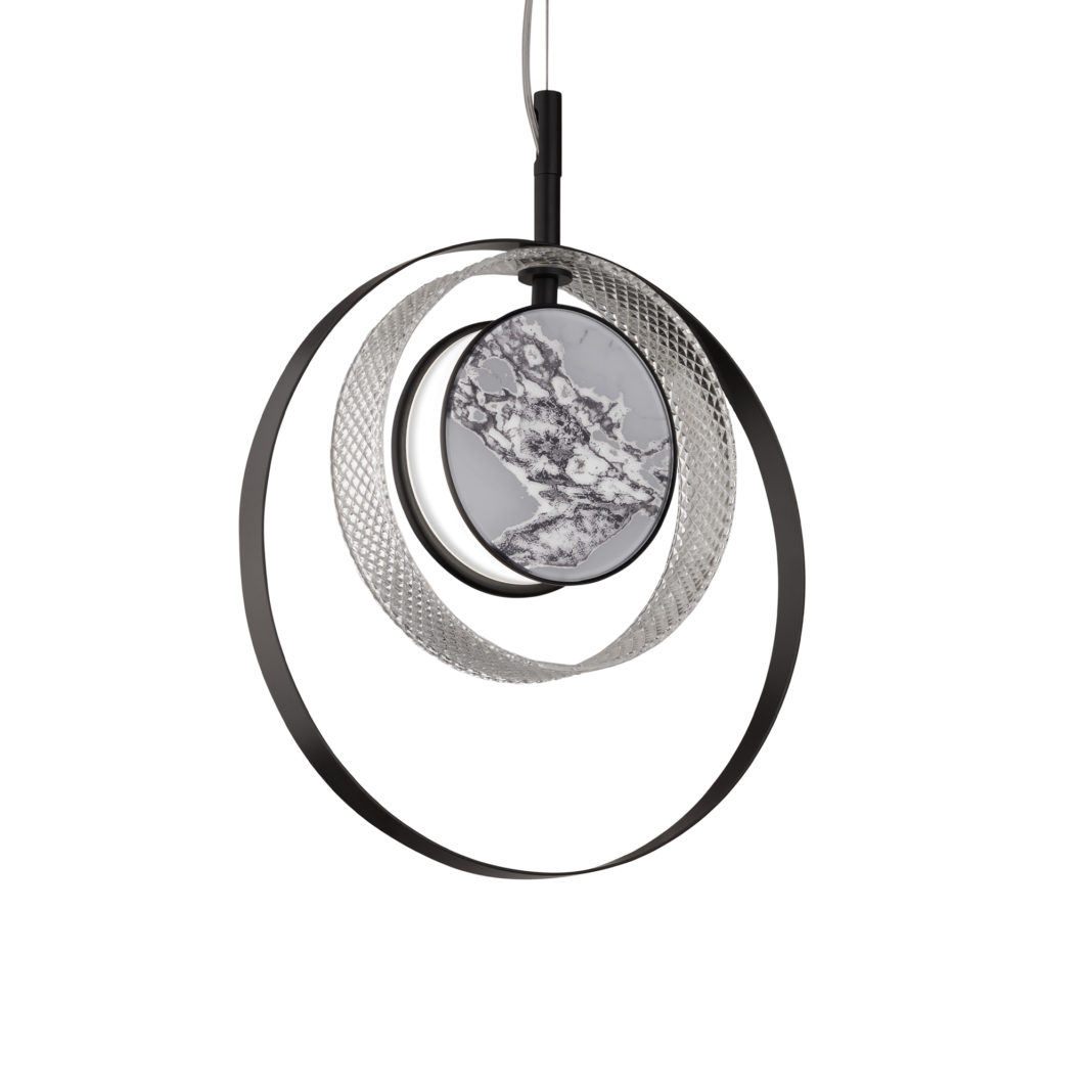 A simple round ceiling rose supports the perfect combination of three concentric circles, varying in materials. A handcrafted aluminium and metal structure in a satin gold finish, supporting a dazzling hand-cut diamond effect glass ring and inner round glass diffuser element with a reproduction effect of precious Calacatta natural marble by digital transfer. With LED lighting highlighting the hand-cut glass, creating a dramatic effect. Strip-LED lighting 15W – 3000°K – 24 Vdc 1368 lm – life time 30.000 hrs SMD Type 5630. Compatible with dimmable systems. Dimensions are plus hanging wire. Available with shiny gold, black nickel or matt black RAL metal finishes, and with a Calacatta electric silver, Tan Grain or quartzite brown marble effect by request. Prices will vary.