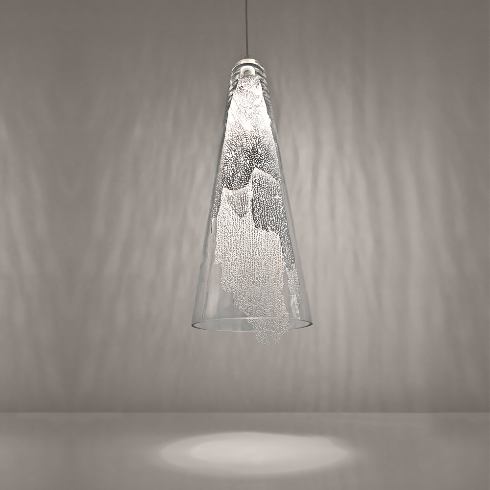Contemporary Silver High End Pendant Light. This fabulous eye-catching design is intelligent and subtle. Encased in the highest quality Borosilicate glass is a delicate silver metal imprint of a coral leaf. Hidden inside a cone shaped glass shade is a single bulb, projecting a dynamic shadow making this unique design outstanding in its simplicity. Borosilicate glass is known for its exceptional quality and durability taking this light to the next level of superiority.