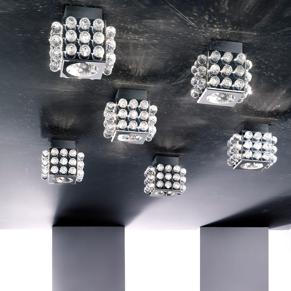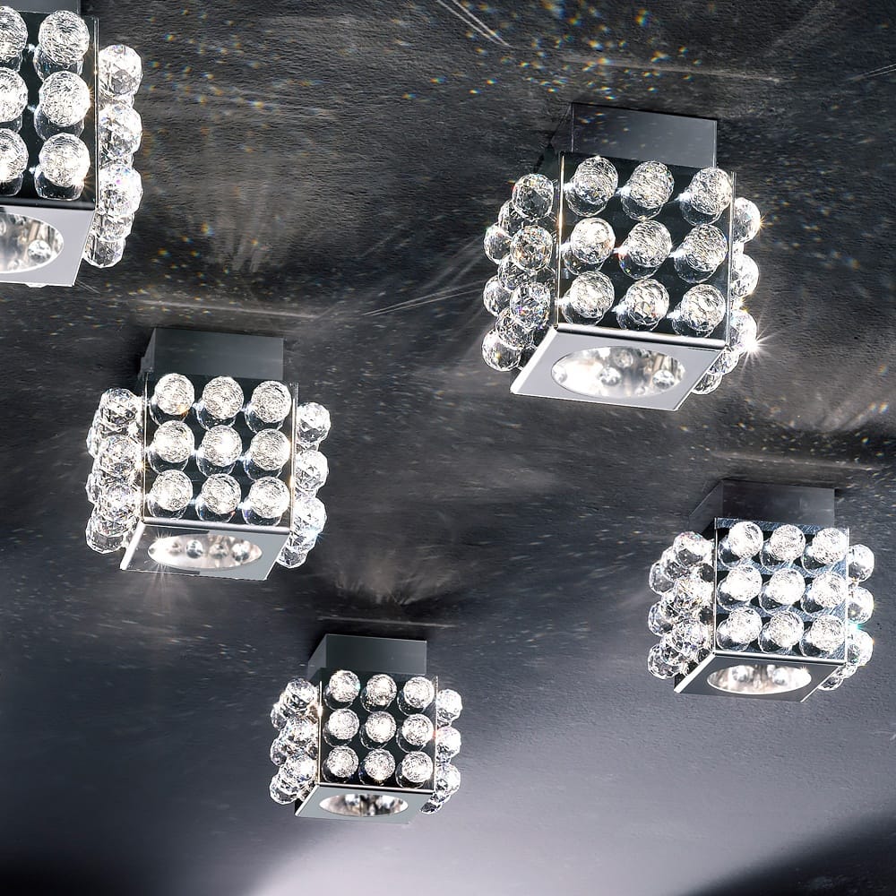 The Contemporary Steel Crystal Ceiling Light is fabulous. This contemporary ceiling light provides a glamorous modern element with its polished stainless steel cubed design decorated with crystal faceted spheres.