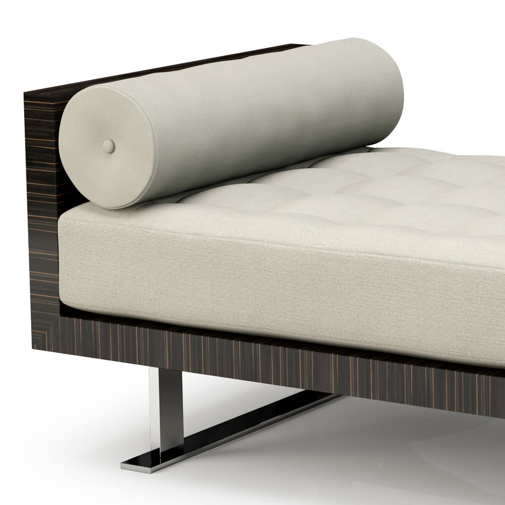 Offering a chic modern focus, made by the finest furniture makers in a contemporary style. Featuring a striking ebony veneered frame together with steel legs. Superbly upholstered and padded with a luxury taupe fabric along with two bolster cushions to each end. Alternative sizes, fabrics, seat hardness and finishes available by request. This sublime collection also offers a premium monogram service, where soft furnishings can be beautifully embroidered with your personal initials or signature. Price will vary.