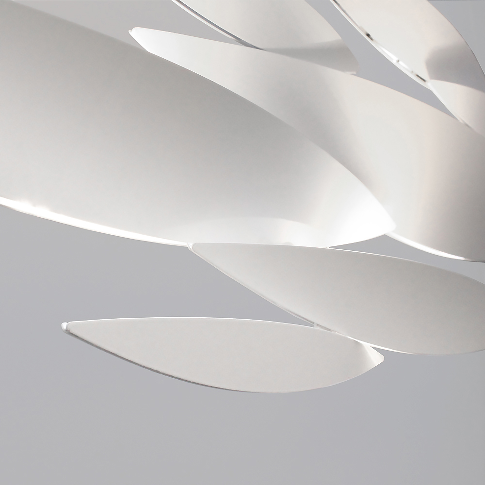 Contemporary White Metal Pendant Light. This beautiful rhythmic design draws its inspiration from a school of glittering fish darting through fresh water. The smooth clean metal finish emphasises the streamlined effect. From beneath, thin incisions allow the light to spill out creating an undemanding tranquil beauty. A fluid mesmerising design for a serene atmosphere to your contemporary home.