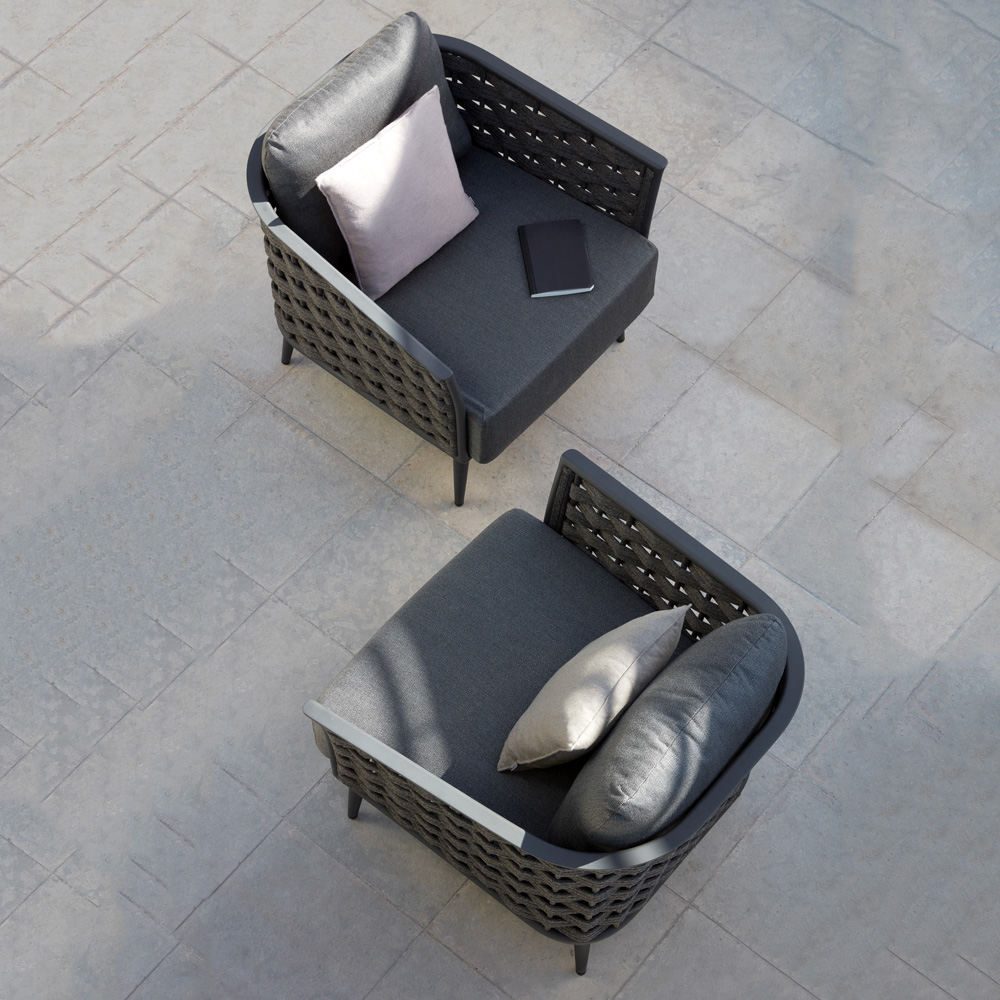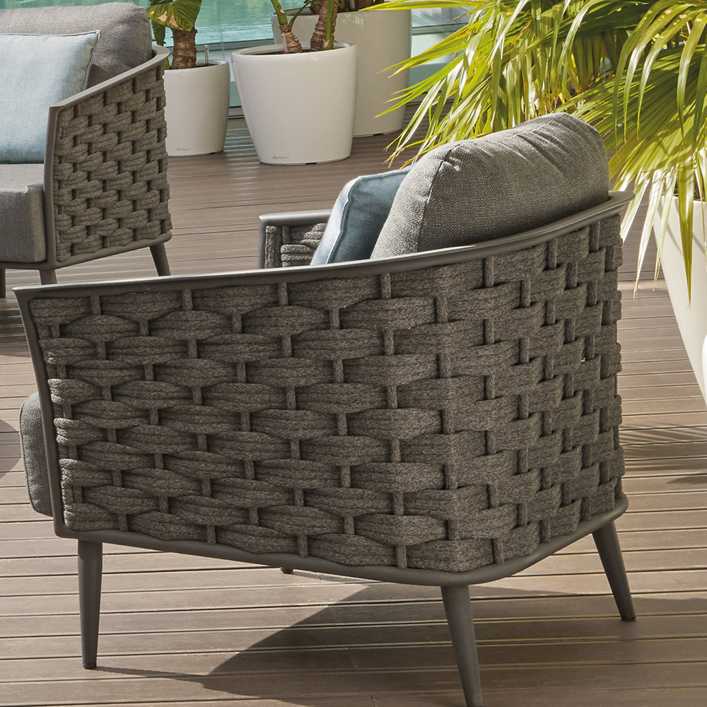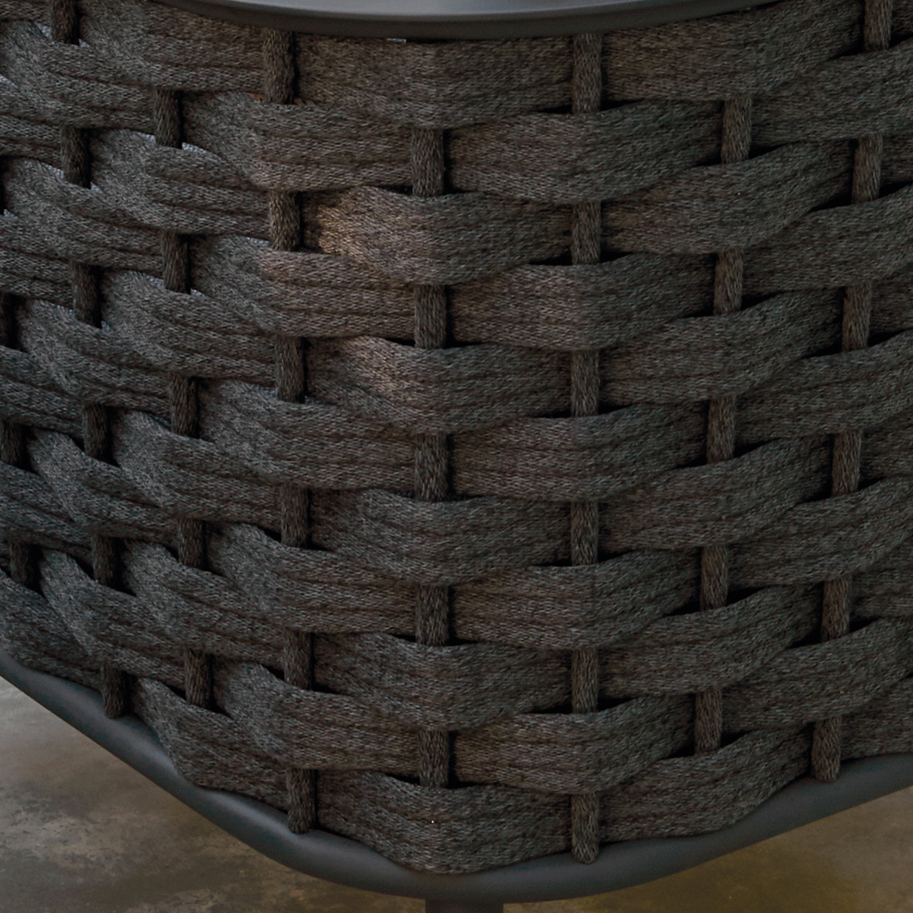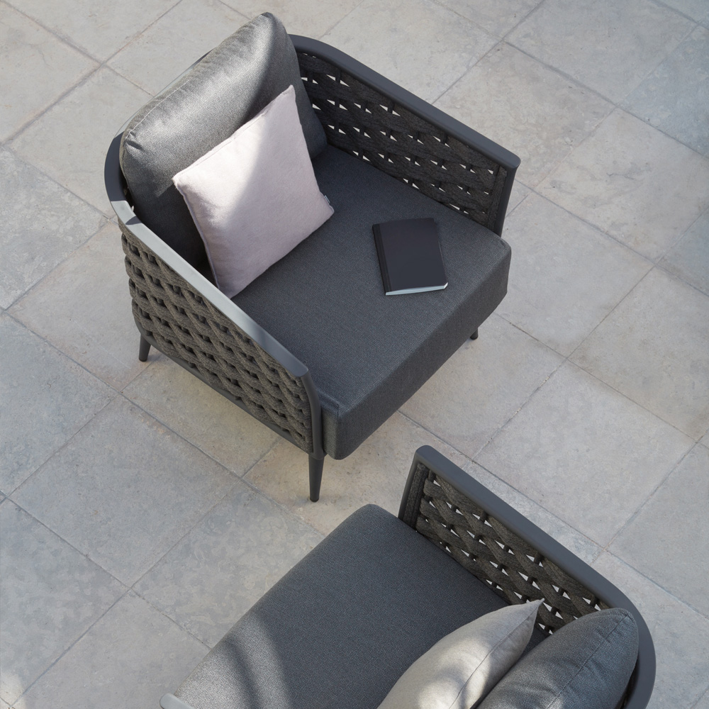 Superbly executed by master craftsmen this design is outstanding in its use of luxury materials and attention to detail. Deep plush seating with elegant curves that depict natural shapes, offering the ultimate in comfort and style. Technical complexity, each piece created by hand. Height 69 cm x width 82 cm x depth 84 cm, arm height 60.5 cm. Weight 15 kg. Shown here in an intriguing mix of a powder coated aluminium frame and contemporary 4.5 cm thick anthracite woven rope. Swimming pool and sea water resistant and repellent. Easy to clean and maintain. Recyclable, GreenGuard certified, REACH certified. The finest of All Weather Fabrics, that have been specifically developed for outdoor use. The fabric is mass-coloured, UV-resistant and does not fade under the influence of light or sunshine. Also available in a white and silver combination. This design is also available in a matching sofa and daybed creating a fabulous collection.
