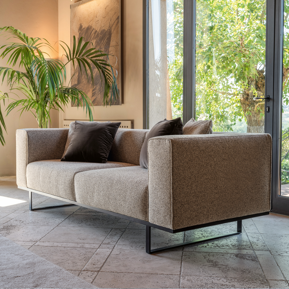 Based on a sturdy wooden frame, this sofa is upholstered in a luxury beige fabric and supported by a metal base and legs in a black graphite finish. Alternative finishes are available upon request. Also available in a larger size and in the same style as an armchair. Prices will vary. Scatter cushions not included.