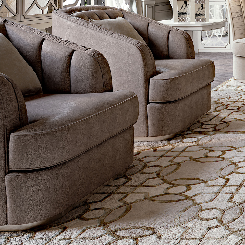 A hand carved solid wooden frame shown here with a luxurious high quality textured Italian leather panelled and ruffled upholstery, perfectly piped and complemented by a beautiful Art Deco inspired plinth in a fabulous silver or gold leaf finish, as shown. Height 90 cm x width 90 cm x depth 95 cm.