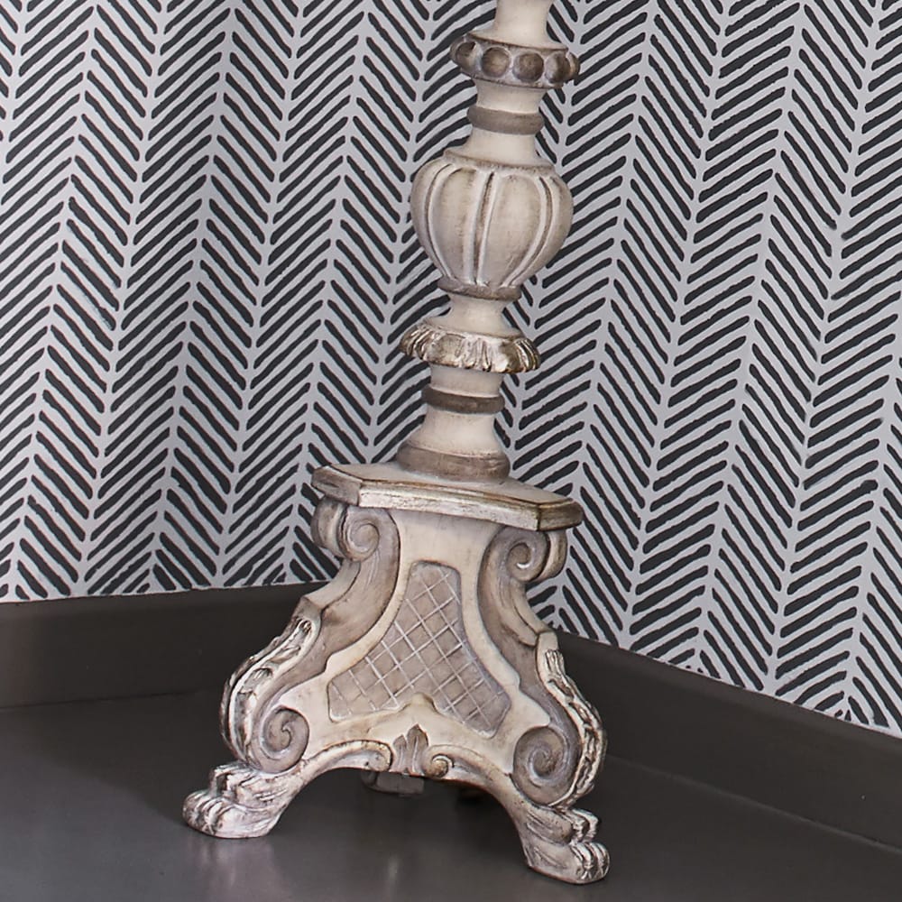 Designed in a classic style making its intricate carvings and painted detail its defining aspect. Shown here in an antique white painted finish, together with beautiful antiqued hand painted accents of silver and sand. Completed with a fresh pleated white shade. Height 180 cm x diameter 65 cm. Uses 1 x E27 max 60 watt bulb, not included. Also available to order in different colours, sizes, finishes and with different shades by request. Prices will vary.