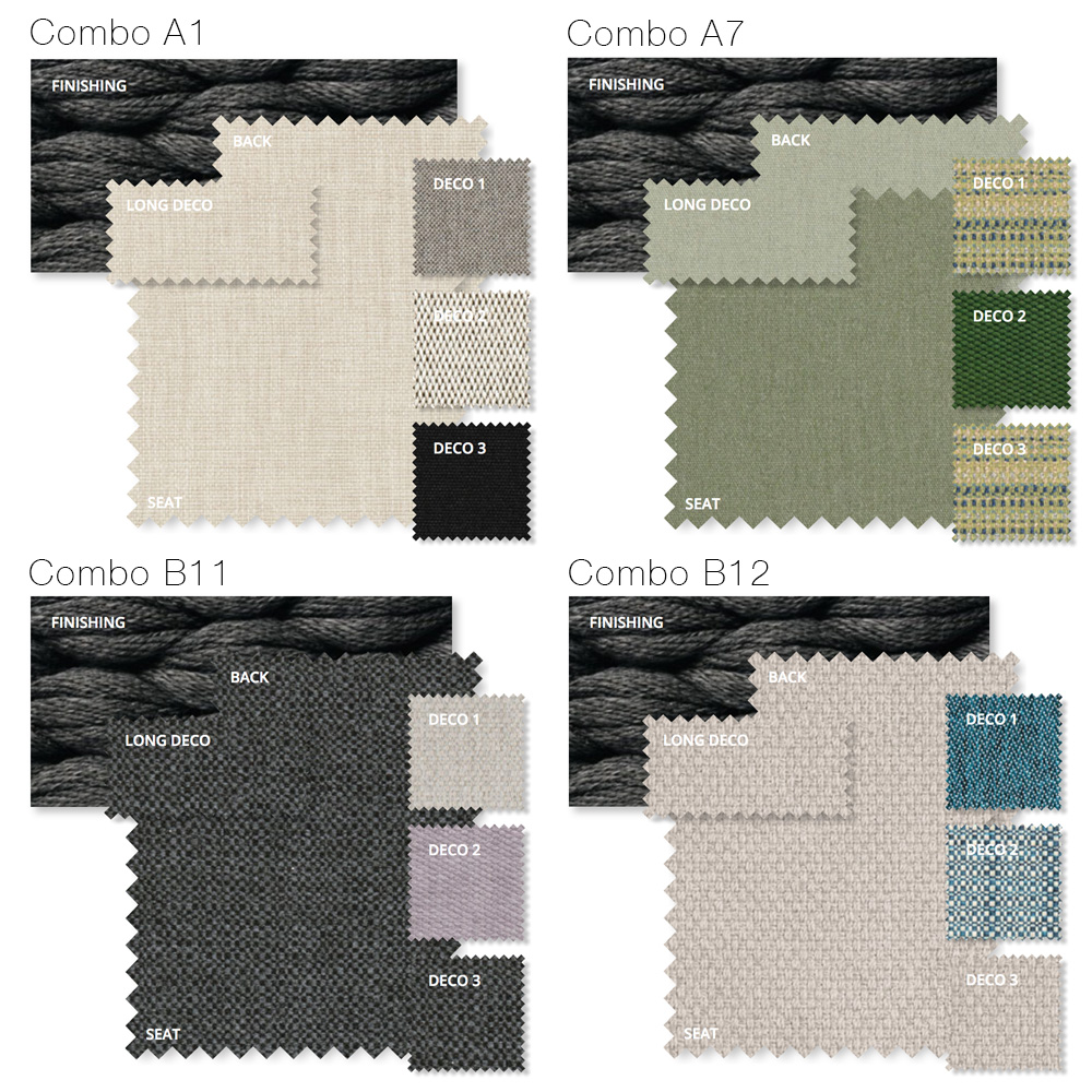Cushions are included and comprise of a seat cushion and back cushion in one piece, a deco cushion measuring 40 cm x 40 cm and a deco cushion of 30 cm diameter. Various combinations are available, as shown. Protective cover also available by request.