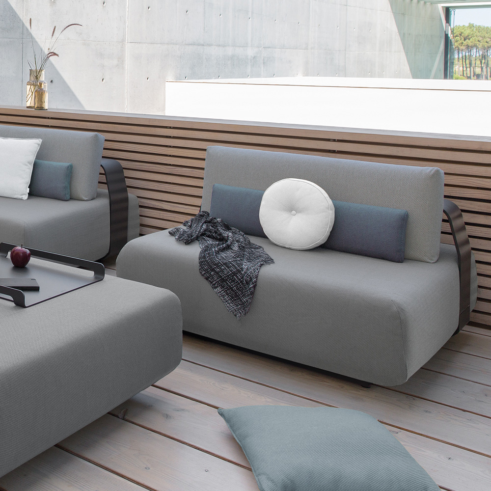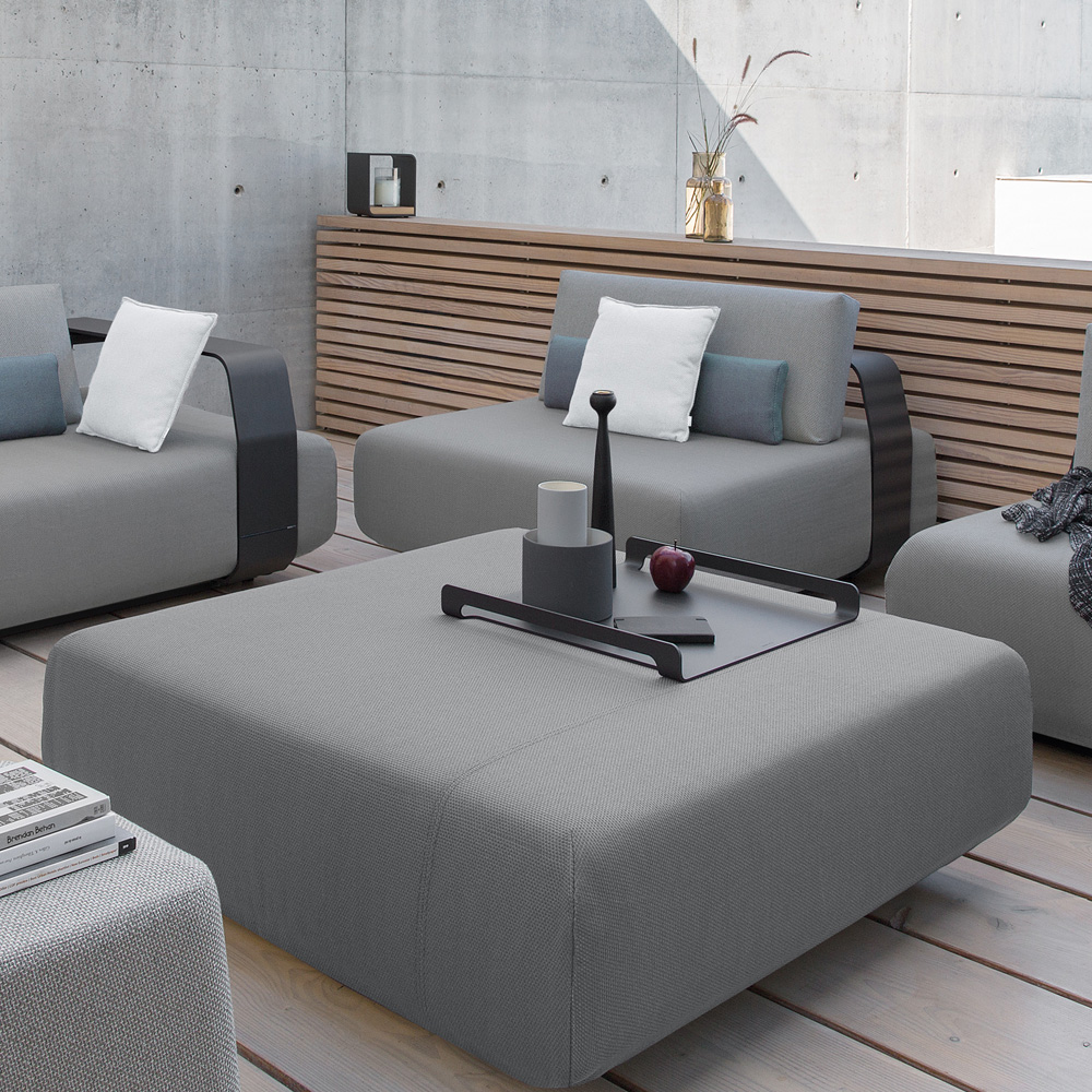 The armrests and back supports are easily adjustable and can be moved around. Mixing and matching orientation was never this easy! Superbly executed by master craftsmen this design is outstanding in its use of luxury materials and attention to detail. Technical complexity, each piece created by hand. Overall width 434 cm x depth 325 cm. Sofa: width 214 cm x depth 107 cm. 2 armchairs: width 107 cm x depth 107 cm. Coffee Table: width 107 cm x depth 107 cm. Shown here in an intriguing mix of an anthracite powder coated aluminium frame and upholstered in a contemporary dove grey inter-changeable upholstery, with Combination B13 cushions. Swimming pool and sea water resistant and repellent. Easy to clean and maintain. Recyclable, GreenGuard certified, REACH certified. The finest of All Weather Fabrics, that have been specifically developed for outdoor use. The fabric is mass-coloured, UV-resistant and does not fade under the influence of light or sunshine. Also available in a taupe and white powder coated frame finish. This design is also available in various combinations.