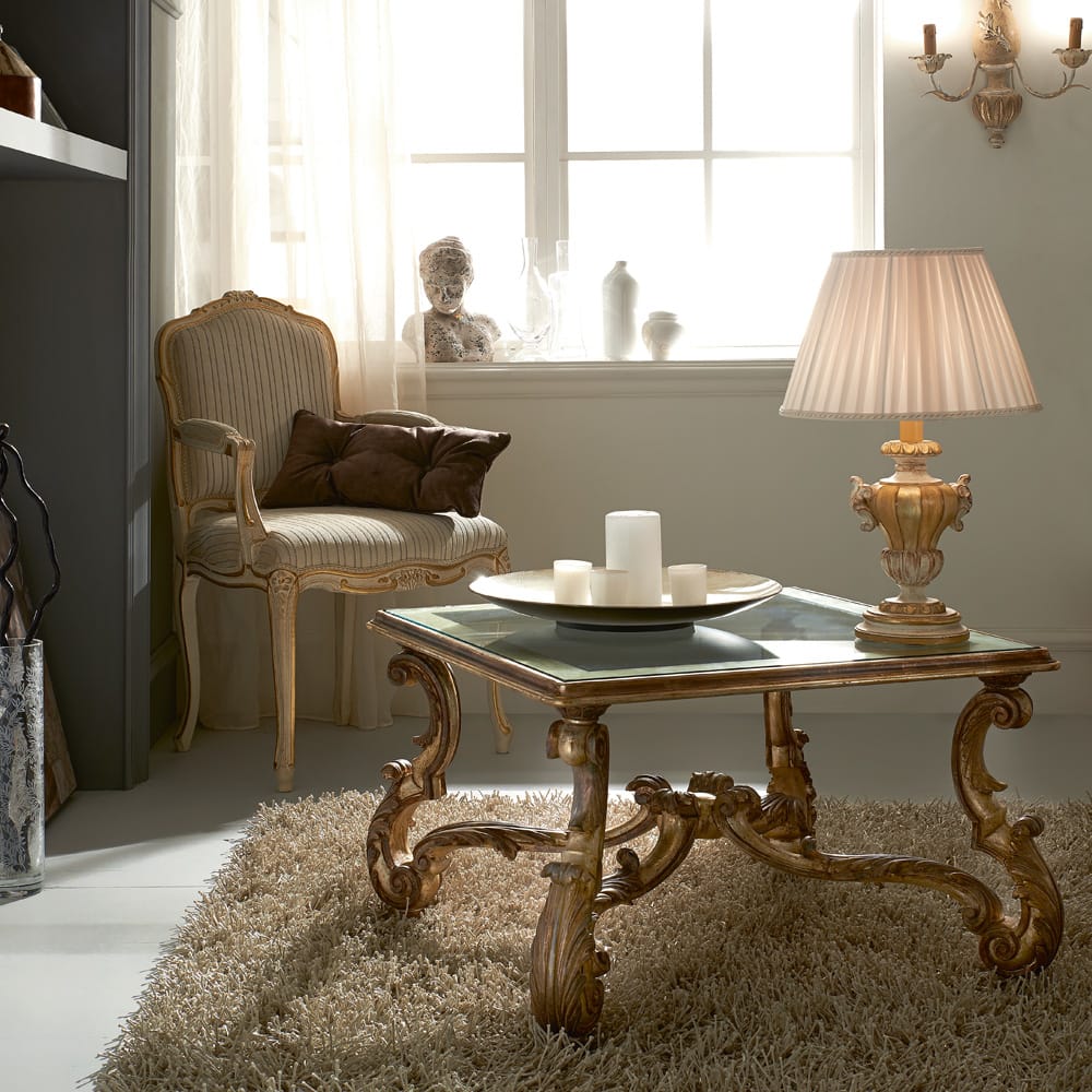 Shown here in an antique silver finish, accentuating the feature cross style frame structure and enhancing the flamboyant carvings. A square glass insert table top completes this fabulous design. Height 47 cm x width 75 cm x depth 75 cm. Available to order in different colours, sizes and finishes by request. Prices will vary.