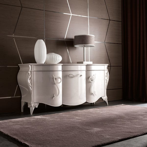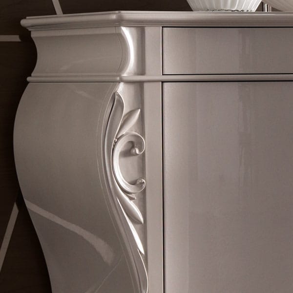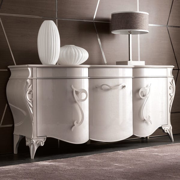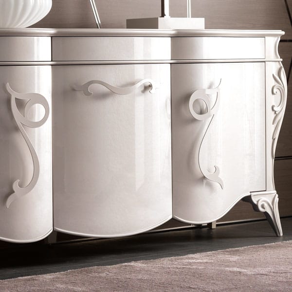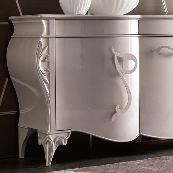 The Designer Italian Elaborate 3 Door Cabinet with internal shelves and 3 push-pull drawers is a beautiful piece for any room in the house. Shown here in a high gloss mother of pearl dove grey finish with matching handles. Height 95 cm x width 201 depth 58 cm. Also available in a 2 door option as standard, height 95 cm x width 141 depth 58 cm. Alternative finishes and customised sizes are available to order.