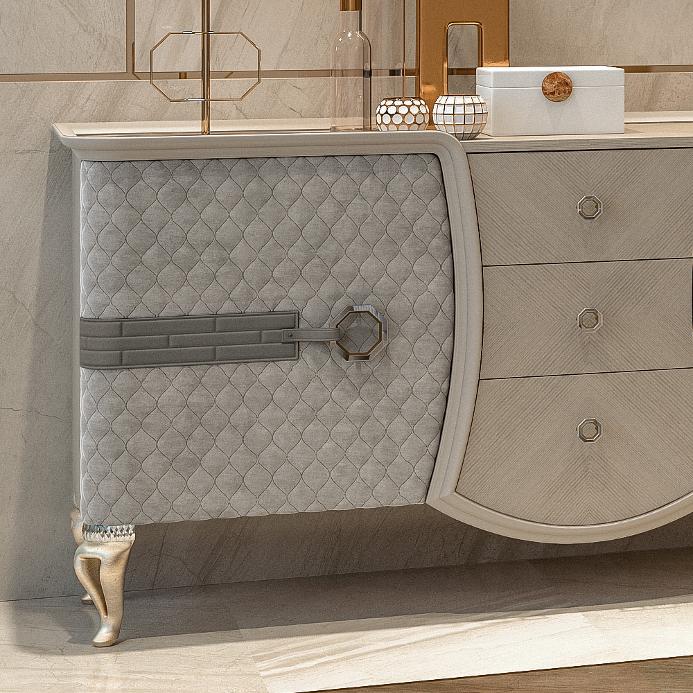 A hand-crafted wooden structure in a lacquered patterned veneer to the top, sides and three central drawers, casting a luxurious presence. The drawers are fitted with an integrated soft close blumotion system for effortless closing. The two cabinet doors to either side are beautifully padded and quilted to the highest standards in a fresh faux nubuck leather, creating the most dramatic of statements. Adorned with the finest geometric feature handles. Curved champagne legs embellished with shimmering crystals adds to the overall luxurious feel, and completes the design. Available in alternative veneers, leathers and fabrics including customers own. Prices will vary.