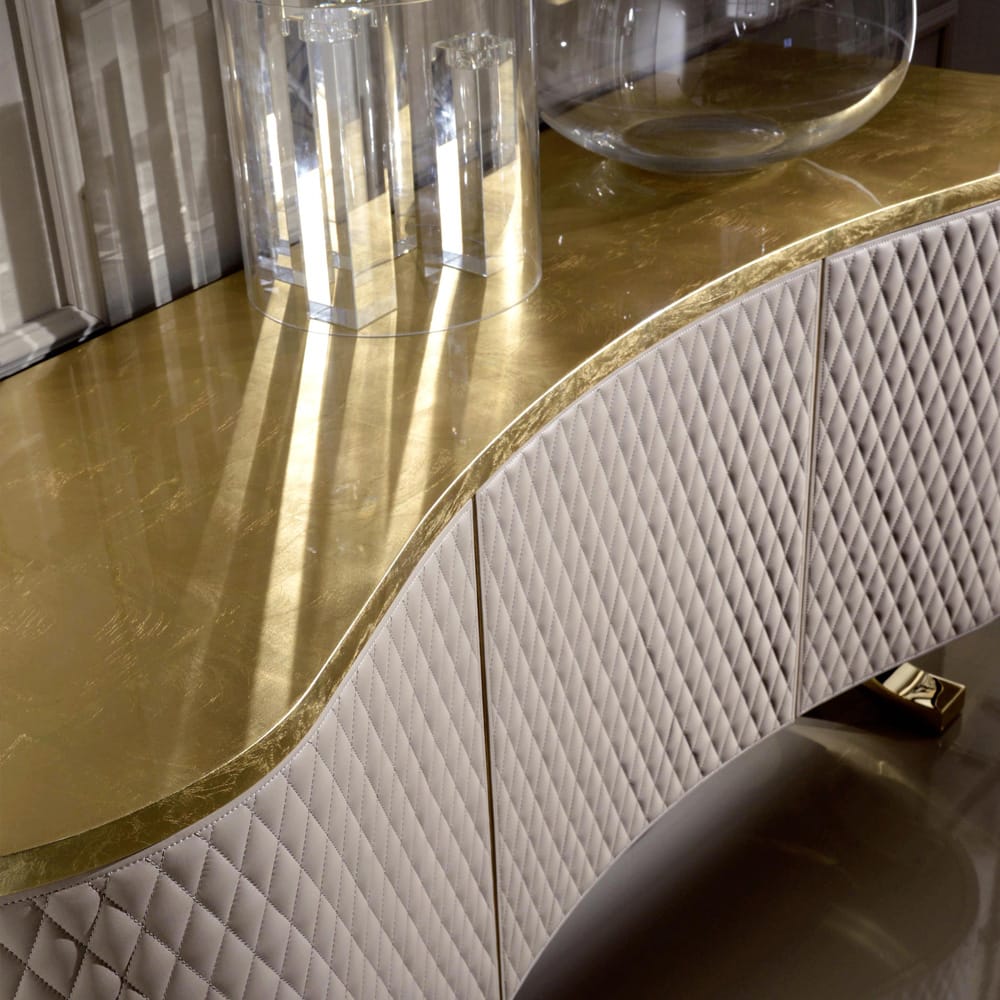 The Designer Italian Quilted Leather Sideboard Buffet, shown here in a gold leaf finish with 3 quilted fine Italian leather cabinet door fronts. On polished 24 carat gold plated iconic legs with internal shelving. The doors are fitted with a push open system which accentuates the streamlined appeal. Use this beautiful sideboard as a glamorous focus in a dining or living room. In two sizes as standard. 3 door as shown, height 94 cm x width 180 cm x depth 58 cm and 4 door, height 94 cm x width 240 cm x depth 58 cm.