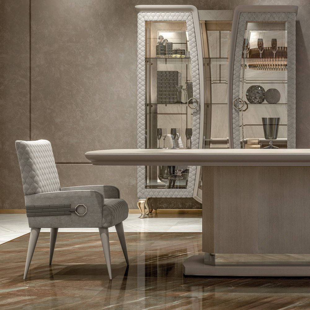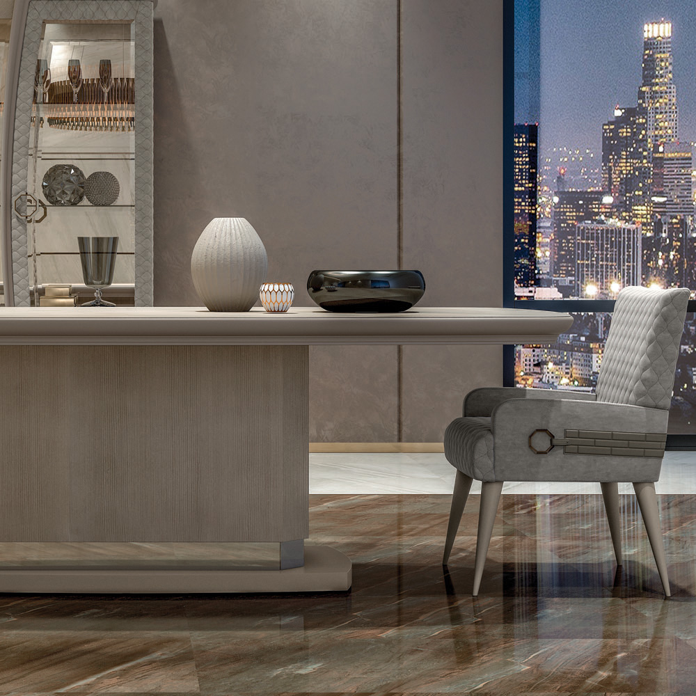 The fixed rectangular table that is a balance by design, giving the whole structure an unexpected lightness. A plinth style steel base in a lacquered and upper mirrored finish, with a pedestal in a veneered finish. In 2 sizes as standard, height 78 cm x width 250 cm x depth 125 cm and height 78 cm x width 300 cm x depth 125 cm. Paired here with the Designer Italian Quilted Dining Chair with wooden legs in a lacquered finish, beautifully padded and quilted to the highest standards in a fresh faux nubuck leather. Creating the most dramatic of statements. Adorned with the finest geometric and panel upholstery feature detailing. Height 85 cm x width 57 cm x depth 60 cm. Creating a truly fabulous focus. Available in alternative veneers, leathers and fabrics including customers own. Prices will vary. Lazy susan available.