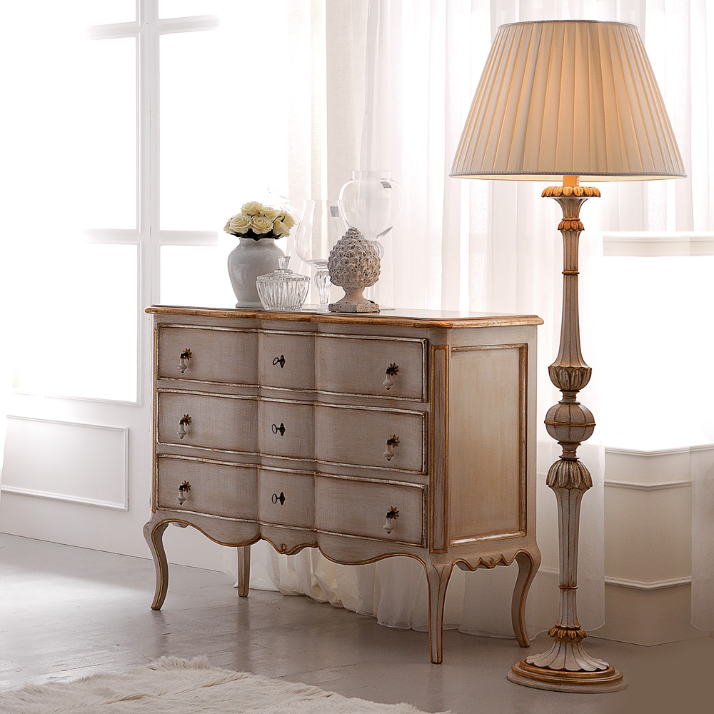 The Designer Italian Reproduction Gold Leaves Floor Lamp is a statement piece for any room in the house. Shown here in an antique ivory finish together with hand painted gold detailing and an ivory pleated shade. Also available with different colours, finishes and without the shade. Height 185 cm x diameter 65 cm. This floor lamp is shown here as part of a bedroom set, also pictured and available too. Made to highest standards. Allow 12 weeks for dispatch. The subtle finishes of the unique Florence Collection with every detail designed to be exclusive.