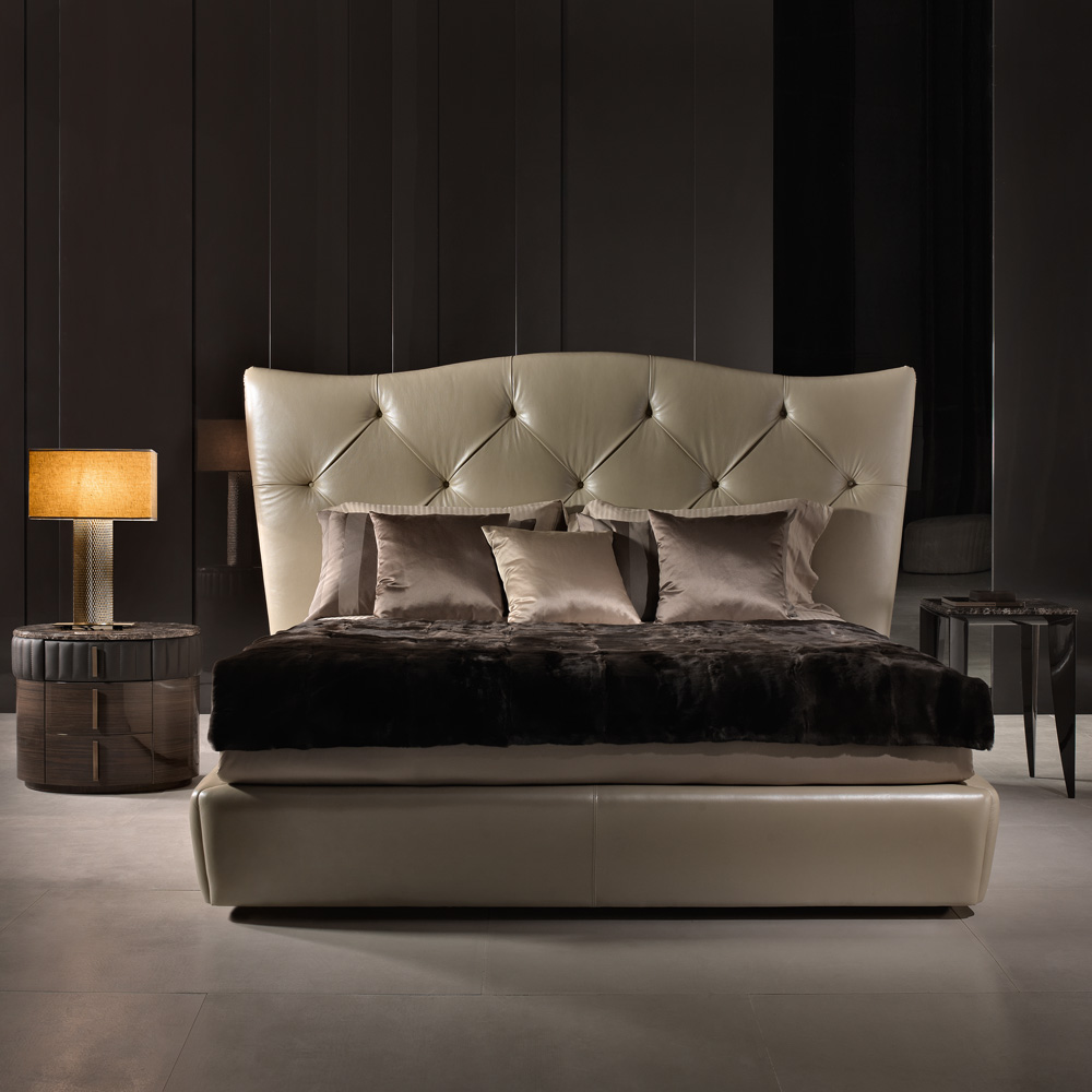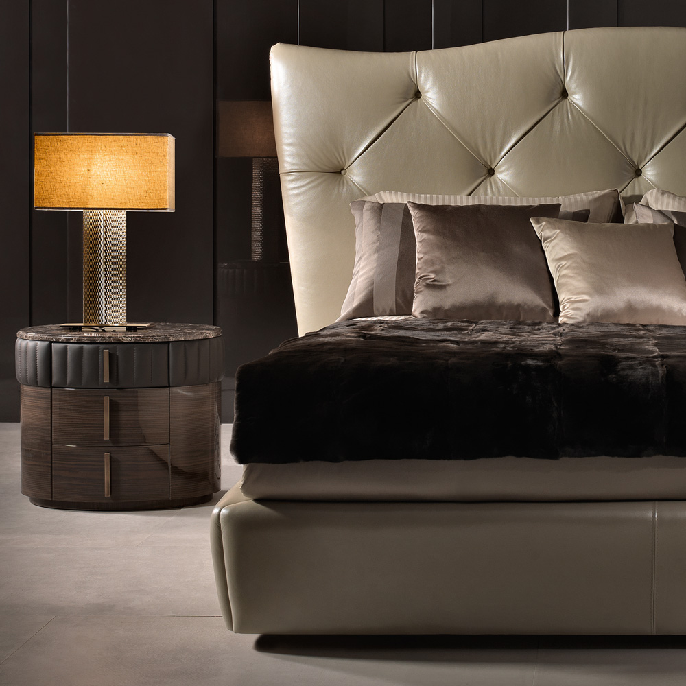 A wooden structure with sleek curves is finished in a dark walnut glossy veneer casting a luxurious presence. A distinctive warm brown leather design detail, beautifully padded and quilted creating the most dramatic of statements. Three fabric lined drawers, one hidden – with soft metal runners for effortless closing, are embellished with handles in brass with a burnished brass finish. An oval Emperador marble top adds to the overall feel, and completes the design. Height 55 cm x width 65 cm x depth 45 cm. Weight 45 kg. Available in alternative veneers, marbles, leathers and fabrics including customers own. Leather top also an option. Prices will vary. A larger chest of drawers in the same design is also available, creating a fabulous collection.
