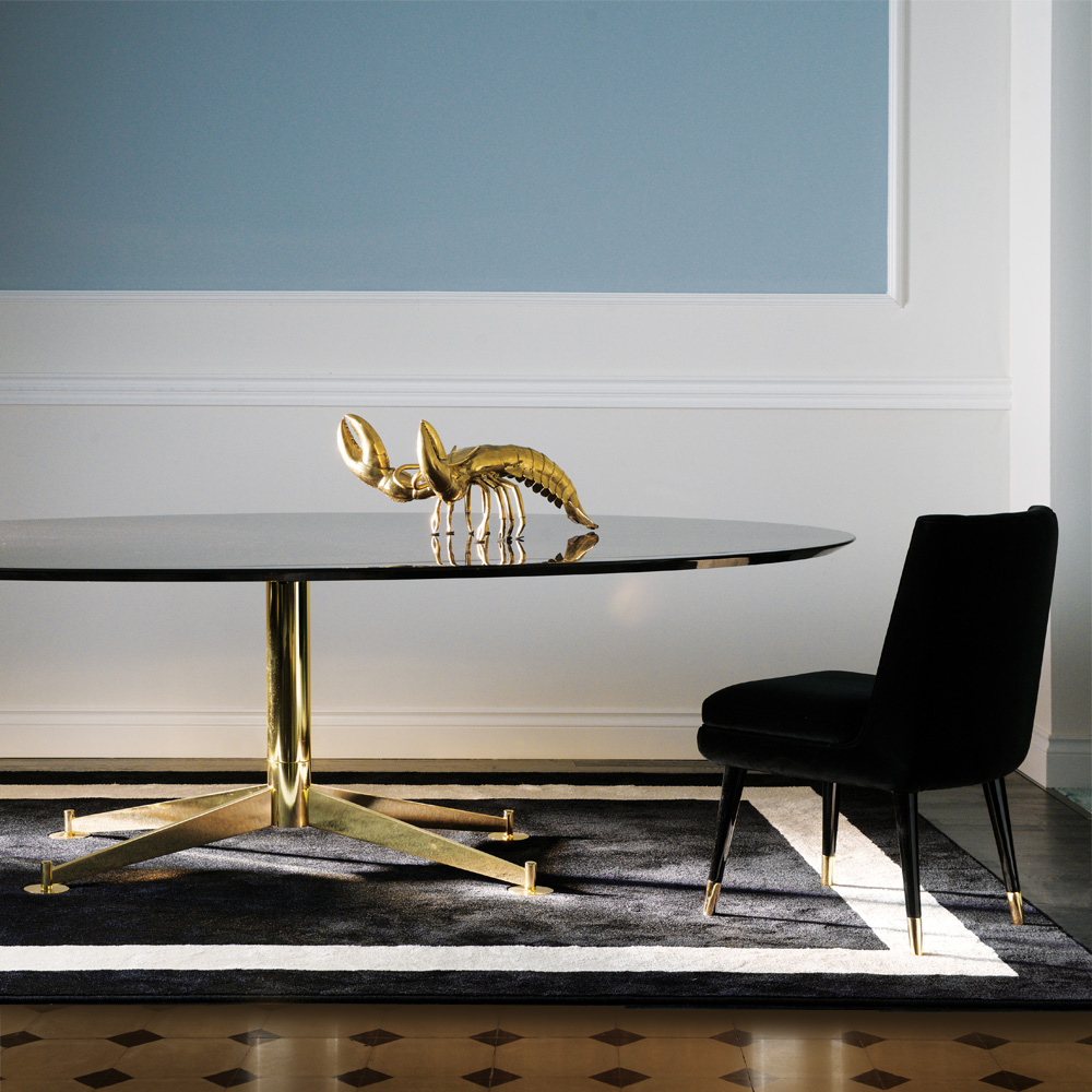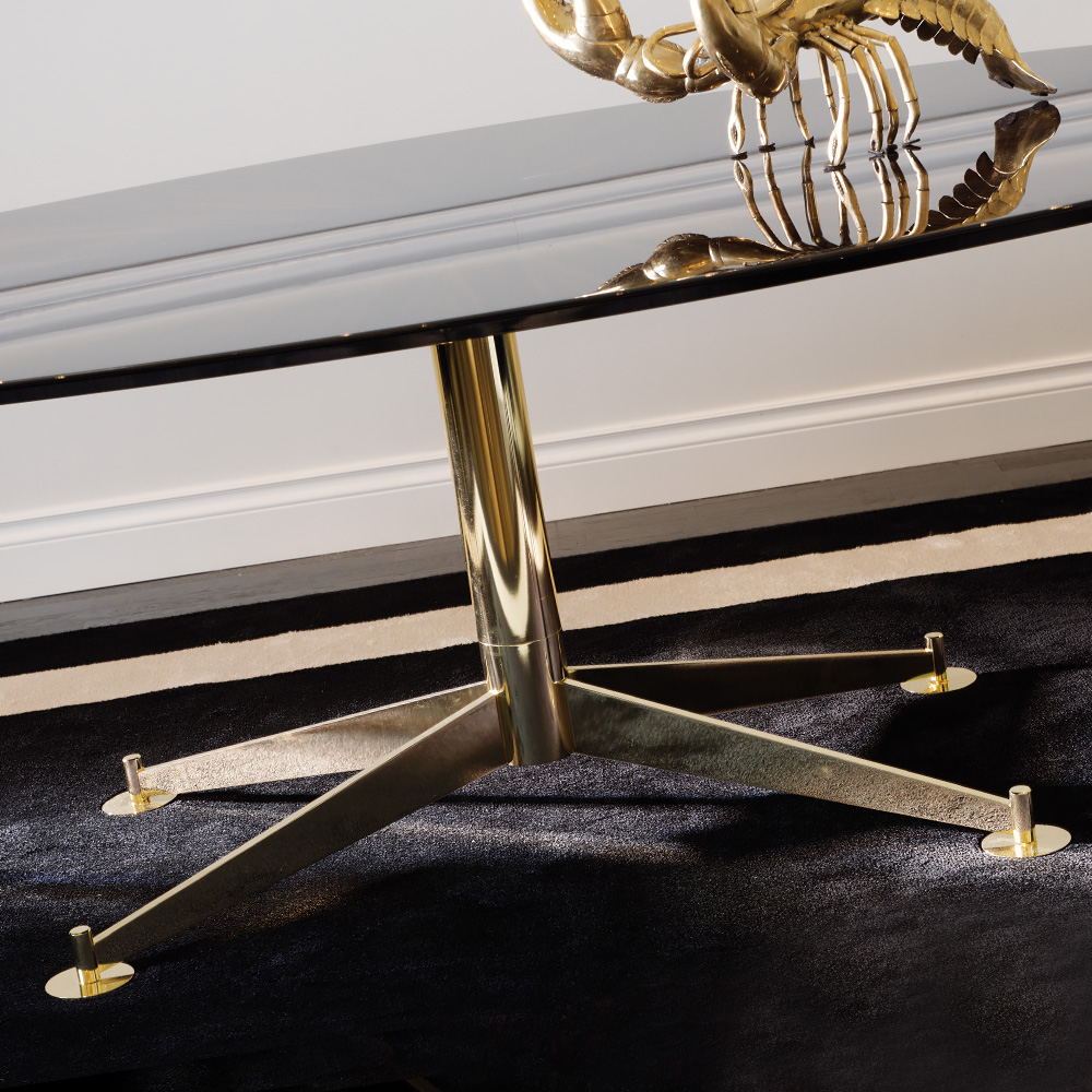 A stylish 3 cm deep Macassar ebony wood veneer oval table top in a gloss finish, perfectly supported by an elegant base in a polished brass finish. Available in 3 sizes as standard, height 75 cm x width 240 cm x depth 120 cm, height 75 cm x width 260 cm x depth 130 cm, height 75 cm x width 260 cm x depth 140 cm. Table also available with the base in a bronze, polished chrome or lacquered finish, with table tops in alternative finishes including any matt or high gloss RAL lacquer. Prices will vary.