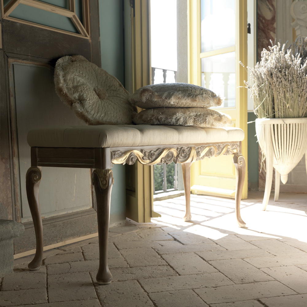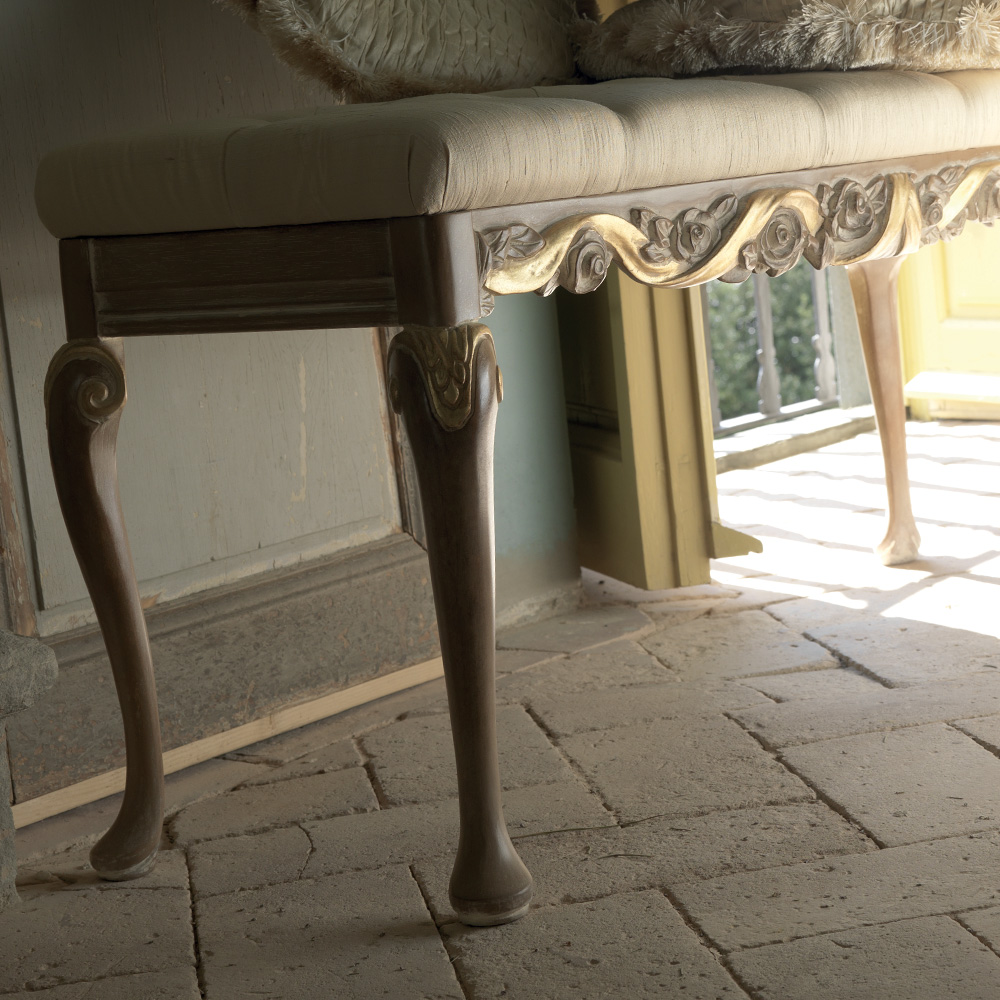 The Designer Rose And Ribbon Italian Bench is shown here in an antique ivory finish with a beautifully hand painted gold finish to the entwined ribbon details. Upholstered with a luxurious ivory satin fabric. Available in different finishes and fabrics to order. Prices will vary. Height 54 cm x width 118 cm x depth 40 cm. The cushions are not included in the price but are available.