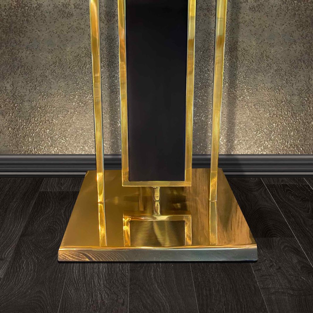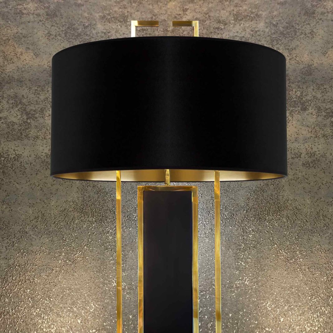 Hand-crafted with remarkable attention to detail by master craftsmen. Modern in style, a beautiful polished brass structure with exquisite feature black satin detailing to the body. Offering the perfect contrast, and completed by a black satin luxurious shade. Creating a fabulous focus. Available to order in different colours, sizes, fabrics and finishes by request. Prices will vary.