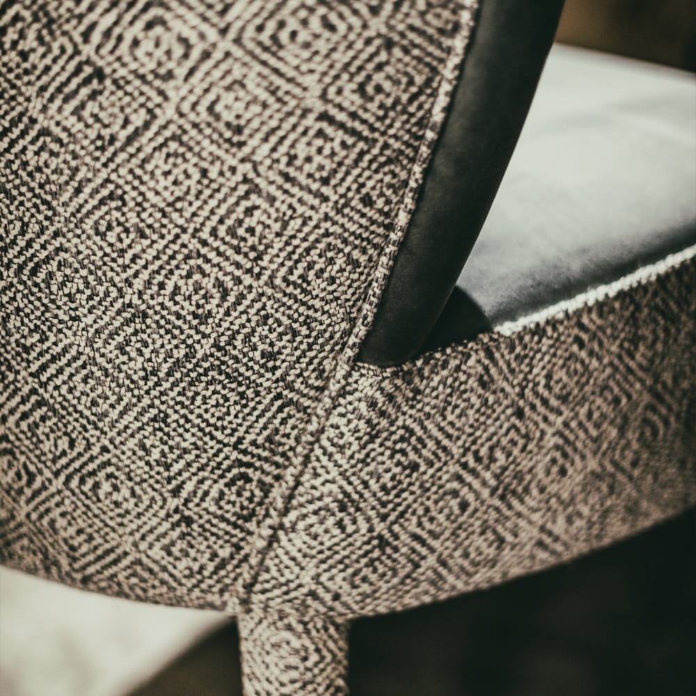 The structure of the chair is built on a solid beech wooden frame, with a helical steel spring system. Padded in foam and memory foam in various different densities for the ultimate in luxurious comfort. Upholstered to the highest standard in an on trend geometric linen cotton mix continuing to the angled legs, and in perfect contrast the finest blue-grey tone soft velvet. Completed by an ornate handle in a matt bronze finish. Seat height 47 cm, seat depth 50 cm. Non-removable covers. Alternative sizes, finishes, various leathers, fabrics including customers own and combinations and the option of the chair without the handle by request. Prices will vary.