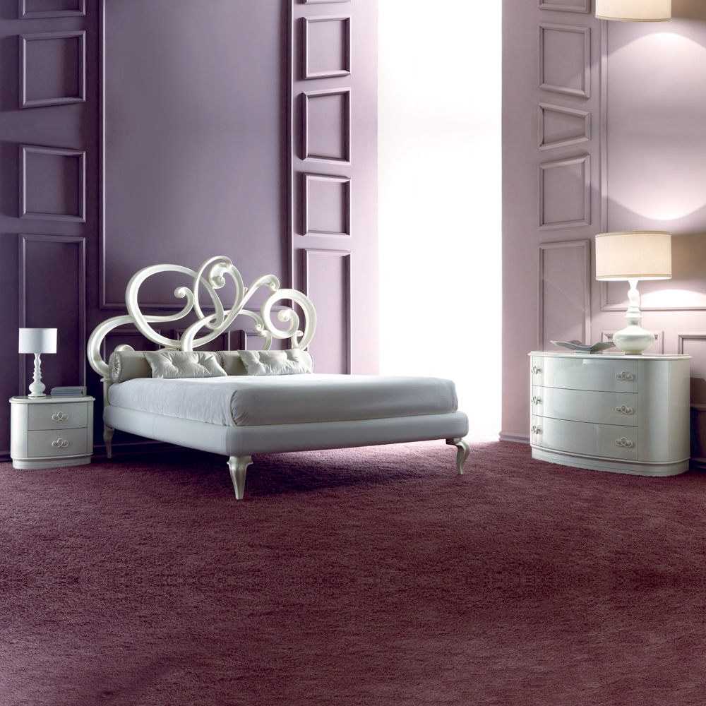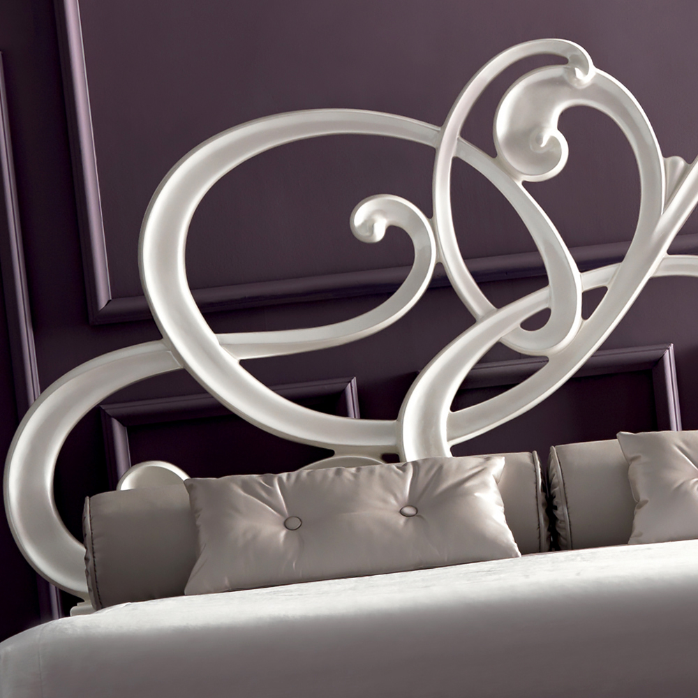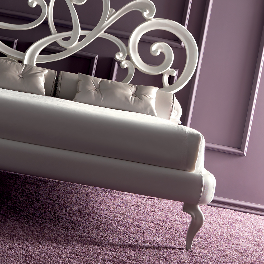 The Designer White Leather Bed, using beautiful finishes this ravishing design creates an enchanting setting. White lacquered pearl spirals and curves provide romance and the use of soft white leather for the upholstered bedrail is simply sublime. Of superb quality this bed offers the ultimate in supreme comfort and style. Overall height is 154 cm. Dimensions to fit the standard 165 cm x 190 cm mattress, bed width 196 cm x length 203 cm. Overall width an additional 31 cm to mattress size and overall length an additional 13 cm to mattress size.