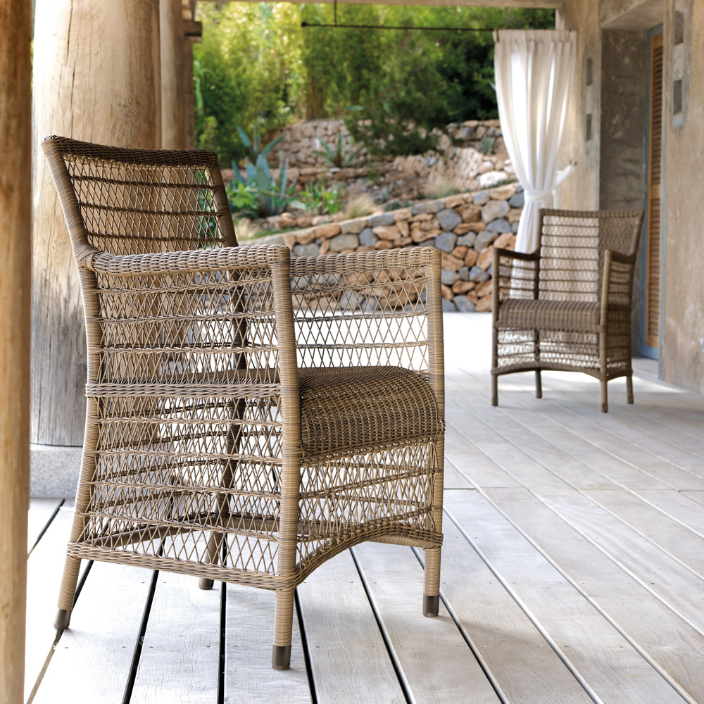 Superbly executed by master craftsmen this design is outstanding in its use of luxury materials and attention to detail. The teak table is height 76 cm x length 265 cm x depth 107.5 cm, and available with various alternative table tops offering the ultimate in versatility. Options such as stones and granites as full tops, or set inside a teak border. Combined with lush seating with elegant curves that depict natural shapes, offering the ultimate in comfort and style. Technical complexity, each piece created by hand. Height 85 cm x width 55 cm x depth 61 cm, arm height 67.5 cm. Weight 6 kg. Shown here in a contemporary 2.8 mm camel tone wicker finish. Upholstery being swimming pool and sea water resistant and repellent. Easy to clean and maintain. Recyclable, GreenGuard certified, REACH certified. The finest of All Weather Fabrics, that have been specifically developed for outdoor use. The fabric is mass-coloured, UV-resistant and does not fade under the influence of light or sunshine. This dining set is also available in a matching sofa, armchair, sun lounger, coffee table, low side table/foot stool and side table creating a fabulous collection.