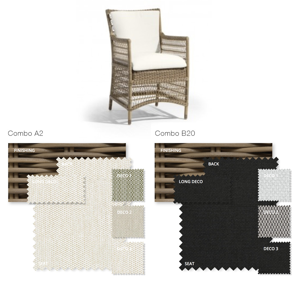 Cushions are included and comprise of a seat cushion and back cushion. Various combinations are available, as shown.