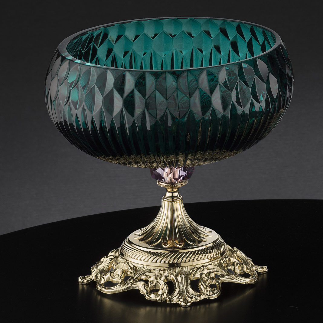 A beautifully detailed ornate brass structure in a shiny Gold finish, with feature violet glass pendant detail and supporting a body of green facet cut glass hand blown in Tuscany. In 2 styles as standard. Vase, height 46 cm x diameter 20 cm – weight 5.5 kg and centrepiece style bowl at height 27 cm x diameter 28 cm – weight 4.5 kg. Available with alternative finishes or in amber or transparent glass colours by request. Prices will vary.