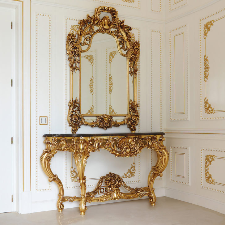 Handcrafted from solid lime wood. This console features an antique gold finish to the most elegant intricate carvings and curved legs. An opulent black and gold marble top that follows the exquisite lines of the console detailing, completes this classic look. Height 90 cm x width 165 cm x depth 56 cm. Featured here with co-ordinating mirror in the same stunning finish. Height 160 cm x width 100 cm.