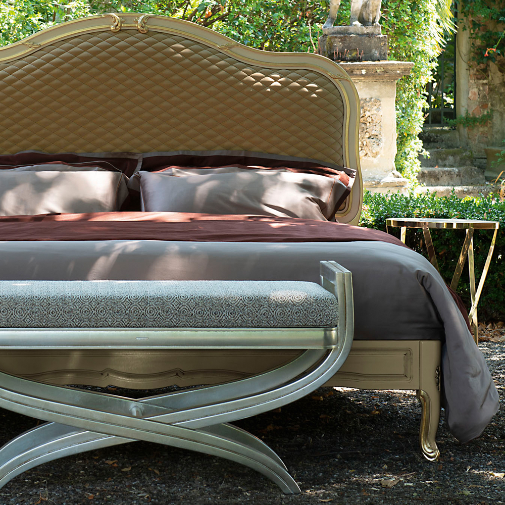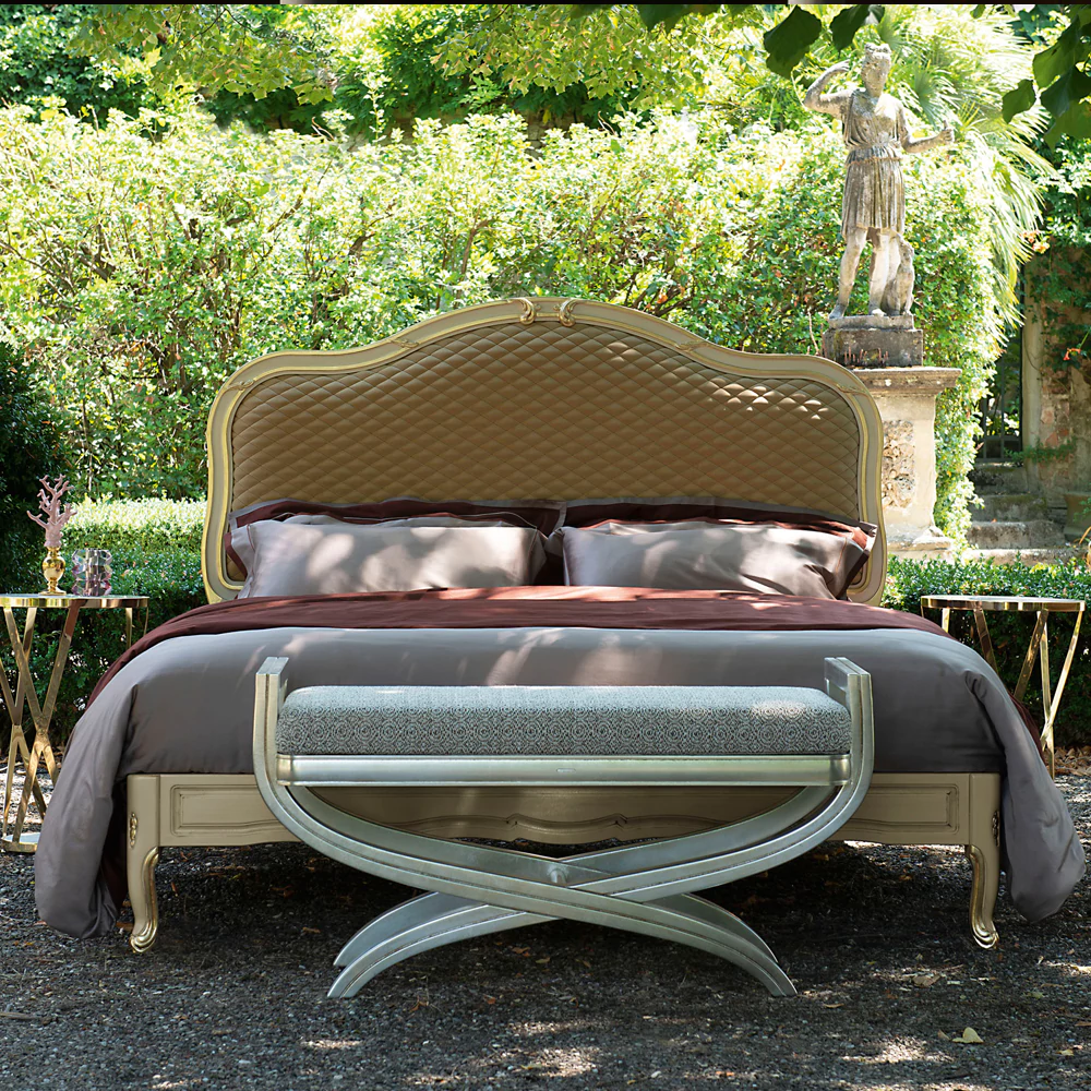 Superbly executed by master Italian craftsmen these designs are outstanding in their use of luxury materials and attention to detail. The headboard and base are finished in a rich Ivory finish, with accents of Gold accentuating the exquisite carved detailing. The headboard is then padded and sumptuously upholstered in an exquisite quilted velvet fabric. Offering a dramatic focus. Height 149 cm x width 189 cm x length 212 cm to fit a 180 cm x 200 cm mattress, height 149 cm x width 208 cm x length 212 cm to fit a 200 cm x 200 cm mattress and height 149 cm x width 169 cm x length 212 cm to fit a 150 cm x 200 cm mattress. Other sizes are available to order with alternative fabrics and leather, including customers own fabric, frame colours and finishes. Prices will vary. Includes headboard, base and slats.